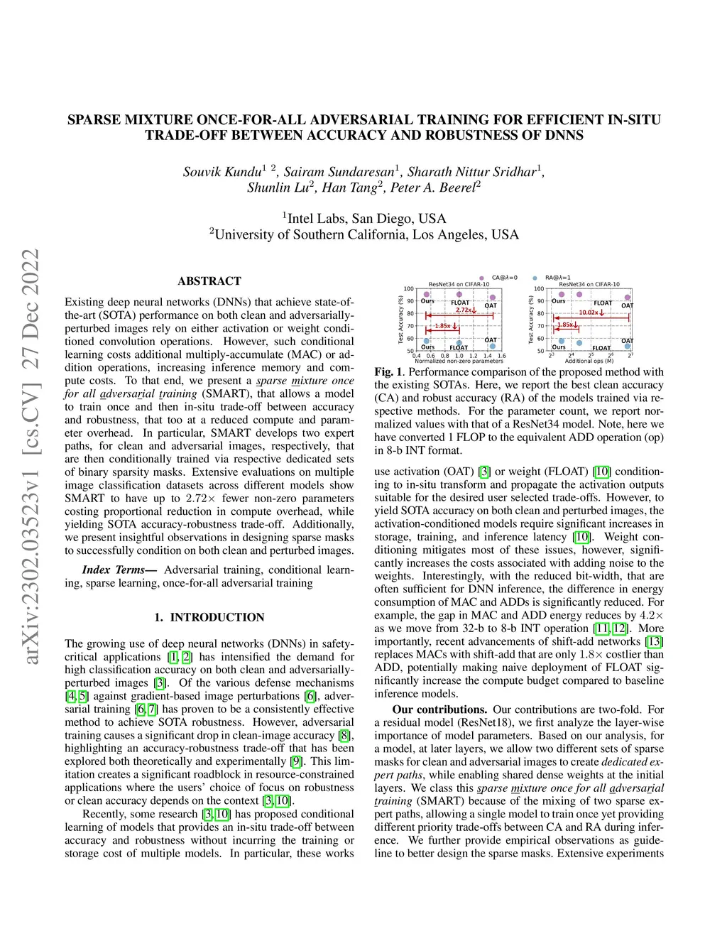 Existing deep neural networks (DNNs) that achieve state-of-the-art (SOTA) performance on both clean and adversarially-perturbed images rely on either activation or weight conditioned convolution operations. However, such conditional learning costs additional multiply-accumulate (MAC) or addition operations, increasing inference memory and compute costs. To that end, we present a sparse mixture once for all adversarial training (SMART), that allows a model to train once and then in-situ trade-off between accuracy and robustness, that too at a reduced compute and parameter overhead. In particular, SMART develops two expert paths, for clean and adversarial images, respectively, that are then conditionally trained via respective dedicated sets of binary sparsity masks. Extensive evaluations on multiple image classification datasets across different models show SMART to have up to 2.72x fewer non-zero parameters costing proportional reduction in compute overhead, while yielding SOTA accuracy-robustness trade-off. Additionally, we present insightful observations in designing sparse masks to successfully condition on both clean and perturbed images.