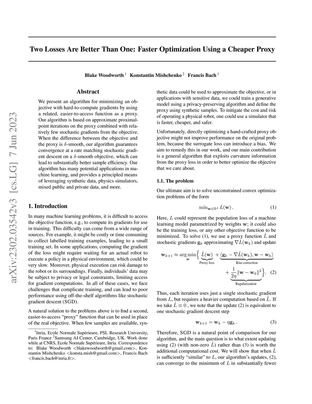 We present an algorithm for minimizing an objective with hard-to-compute gradients by using a related, easier-to-access function as a proxy. Our algorithm is based on approximate proximal point iterations on the proxy combined with relatively few stochastic gradients from the objective. When the difference between the objective and the proxy is -smooth, our algorithm guarantees convergence at a rate matching stochastic gradient descent on a -smooth objective, which can lead to substantially better sample efficiency. Our algorithm has many potential applications in machine learning, and provides a principled means of leveraging synthetic data, physics simulators, mixed public and private data, and more.