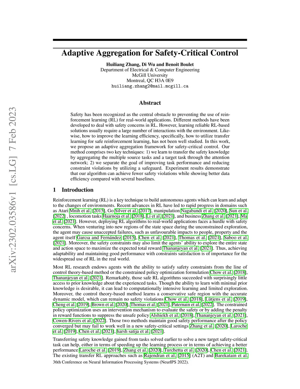 Safety has been recognized as the central obstacle to preventing the use of reinforcement learning (RL) for real-world applications. Different methods have been developed to deal with safety concerns in RL. However, learning reliable RL-based solutions usually require a large number of interactions with the environment. Likewise, how to improve the learning efficiency, specifically, how to utilize transfer learning for safe reinforcement learning, has not been well studied. In this work, we propose an adaptive aggregation framework for safety-critical control. Our method comprises two key techniques: 1) we learn to transfer the safety knowledge by aggregating the multiple source tasks and a target task through the attention network; 2) we separate the goal of improving task performance and reducing constraint violations by utilizing a safeguard. Experiment results demonstrate that our algorithm can achieve fewer safety violations while showing better data efficiency compared with several baselines.