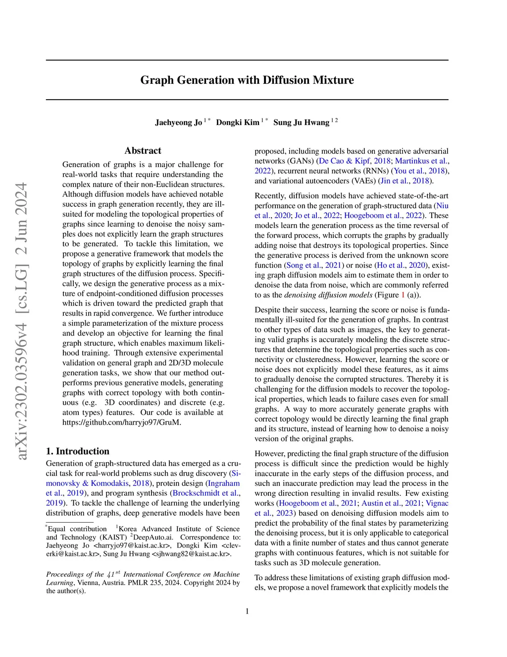 Generation of graphs is a major challenge for real-world tasks that require understanding the complex nature of their non-Euclidean structures. Although diffusion models have achieved notable success in graph generation recently, they are ill-suited for modeling the topological properties of graphs since learning to denoise the noisy samples does not explicitly learn the graph structures to be generated. To tackle this limitation, we propose a generative framework that models the topology of graphs by explicitly learning the final graph structures of the diffusion process. Specifically, we design the generative process as a mixture of endpoint-conditioned diffusion processes which is driven toward the predicted graph that results in rapid convergence. We further introduce a simple parameterization of the mixture process and develop an objective for learning the final graph structure, which enables maximum likelihood training. Through extensive experimental validation on general graph and 2D/3D molecule generation tasks, we show that our method outperforms previous generative models, generating graphs with correct topology with both continuous (e.g. 3D coordinates) and discrete (e.g. atom types) features. Our code is available at https://github.com/harryjo97/GruM.