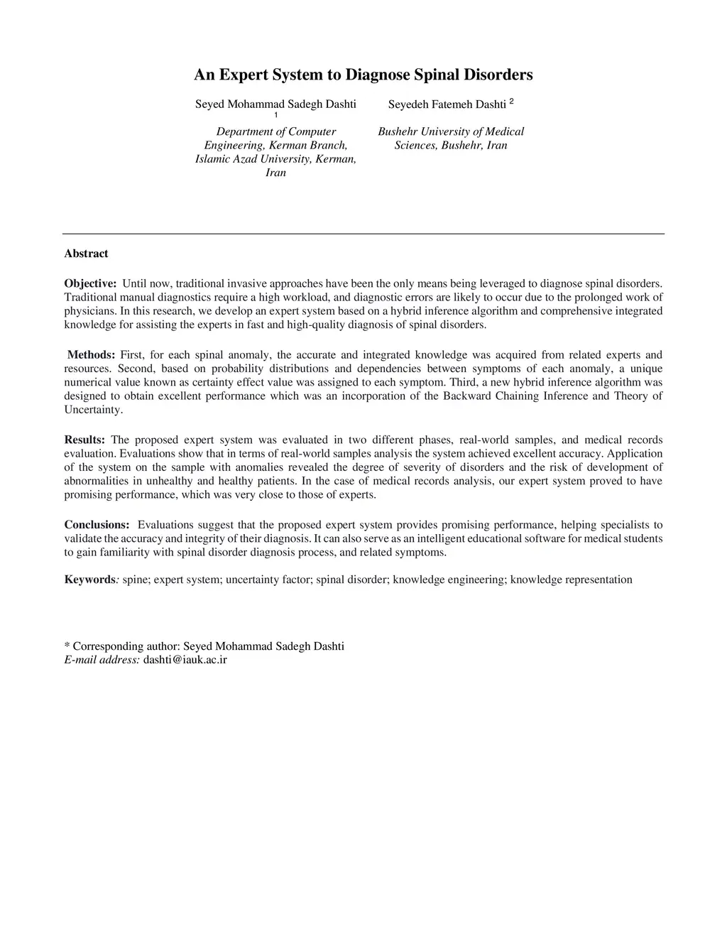Objective: Until now, traditional invasive approaches have been the only means being leveraged to diagnose spinal disorders. Traditional manual diagnostics require a high workload, and diagnostic errors are likely to occur due to the prolonged work of physicians. In this research, we develop an expert system based on a hybrid inference algorithm and comprehensive integrated knowledge for assisting the experts in the fast and high-quality diagnosis of spinal disorders. Methods: First, for each spinal anomaly, the accurate and integrated knowledge was acquired from related experts and resources. Second, based on probability distributions and dependencies between symptoms of each anomaly, a unique numerical value known as certainty effect value was assigned to each symptom. Third, a new hybrid inference algorithm was designed to obtain excellent performance, which was an incorporation of the Backward Chaining Inference and Theory of Uncertainty. Results: The proposed expert system was evaluated in two different phases, real-world samples, and medical records evaluation. Evaluations show that in terms of real-world samples analysis, the system achieved excellent accuracy. Application of the system on the sample with anomalies revealed the degree of severity of disorders and the risk of development of abnormalities in unhealthy and healthy patients. In the case of medical records analysis, our expert system proved to have promising performance, which was very close to those of experts. Conclusion: Evaluations suggest that the proposed expert system provides promising performance, helping specialists to validate the accuracy and integrity of their diagnosis. It can also serve as an intelligent educational software for medical students to gain familiarity with spinal disorder diagnosis process, and related symptoms.