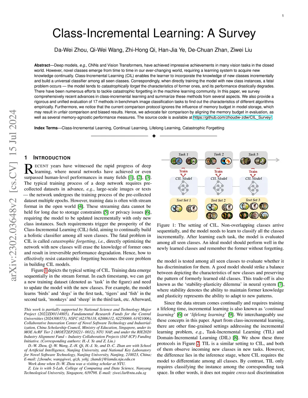 Deep models, e.g., CNNs and Vision Transformers, have achieved impressive achievements in many vision tasks in the closed world. However, novel classes emerge from time to time in our ever-changing world, requiring a learning system to acquire new knowledge continually. Class-Incremental Learning (CIL) enables the learner to incorporate the knowledge of new classes incrementally and build a universal classifier among all seen classes. Correspondingly, when directly training the model with new class instances, a fatal problem occurs -- the model tends to catastrophically forget the characteristics of former ones, and its performance drastically degrades. There have been numerous efforts to tackle catastrophic forgetting in the machine learning community. In this paper, we survey comprehensively recent advances in class-incremental learning and summarize these methods from several aspects. We also provide a rigorous and unified evaluation of 17 methods in benchmark image classification tasks to find out the characteristics of different algorithms empirically. Furthermore, we notice that the current comparison protocol ignores the influence of memory budget in model storage, which may result in unfair comparison and biased results. Hence, we advocate fair comparison by aligning the memory budget in evaluation, as well as several memory-agnostic performance measures. The source code is available at https://github.com/zhoudw-zdw/CIL_Survey/