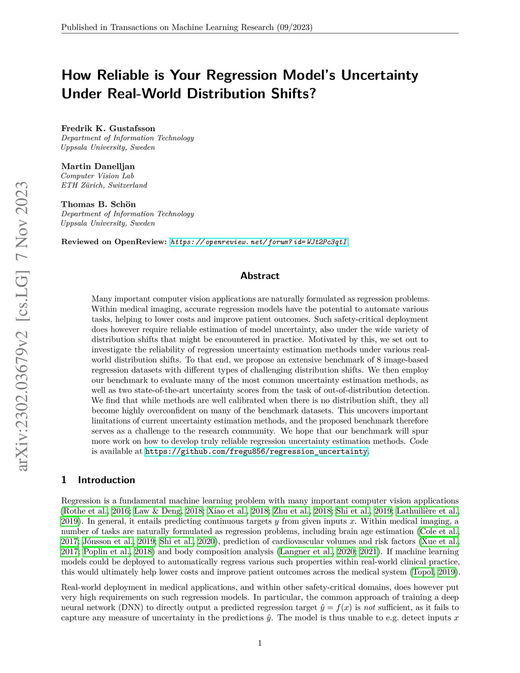 Many important computer vision applications are naturally formulated as regression problems. Within medical imaging, accurate regression models have the potential to automate various tasks, helping to lower costs and improve patient outcomes. Such safety-critical deployment does however require reliable estimation of model uncertainty, also under the wide variety of distribution shifts that might be encountered in practice. Motivated by this, we set out to investigate the reliability of regression uncertainty estimation methods under various real-world distribution shifts. To that end, we propose an extensive benchmark of 8 image-based regression datasets with different types of challenging distribution shifts. We then employ our benchmark to evaluate many of the most common uncertainty estimation methods, as well as two state-of-the-art uncertainty scores from the task of out-of-distribution detection. We find that while methods are well calibrated when there is no distribution shift, they all become highly overconfident on many of the benchmark datasets. This uncovers important limitations of current uncertainty estimation methods, and the proposed benchmark therefore serves as a challenge to the research community. We hope that our benchmark will spur more work on how to develop truly reliable regression uncertainty estimation methods. Code is available at https://github.com/fregu856/regression_uncertainty.