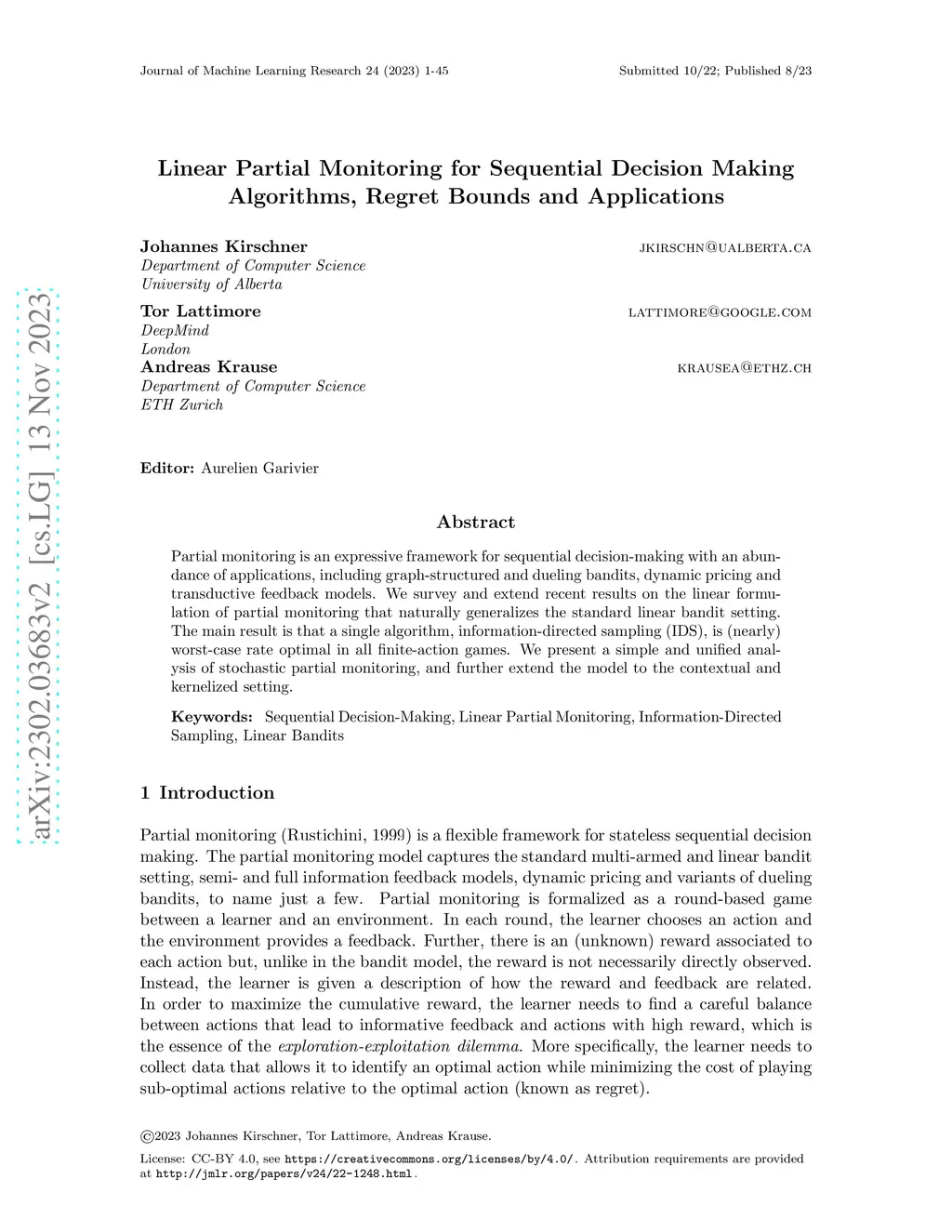 Partial monitoring is an expressive framework for sequential decision-making with an abundance of applications, including graph-structured and dueling bandits, dynamic pricing and transductive feedback models. We survey and extend recent results on the linear formulation of partial monitoring that naturally generalizes the standard linear bandit setting. The main result is that a single algorithm, information-directed sampling (IDS), is (nearly) worst-case rate optimal in all finite-action games. We present a simple and unified analysis of stochastic partial monitoring, and further extend the model to the contextual and kernelized setting.