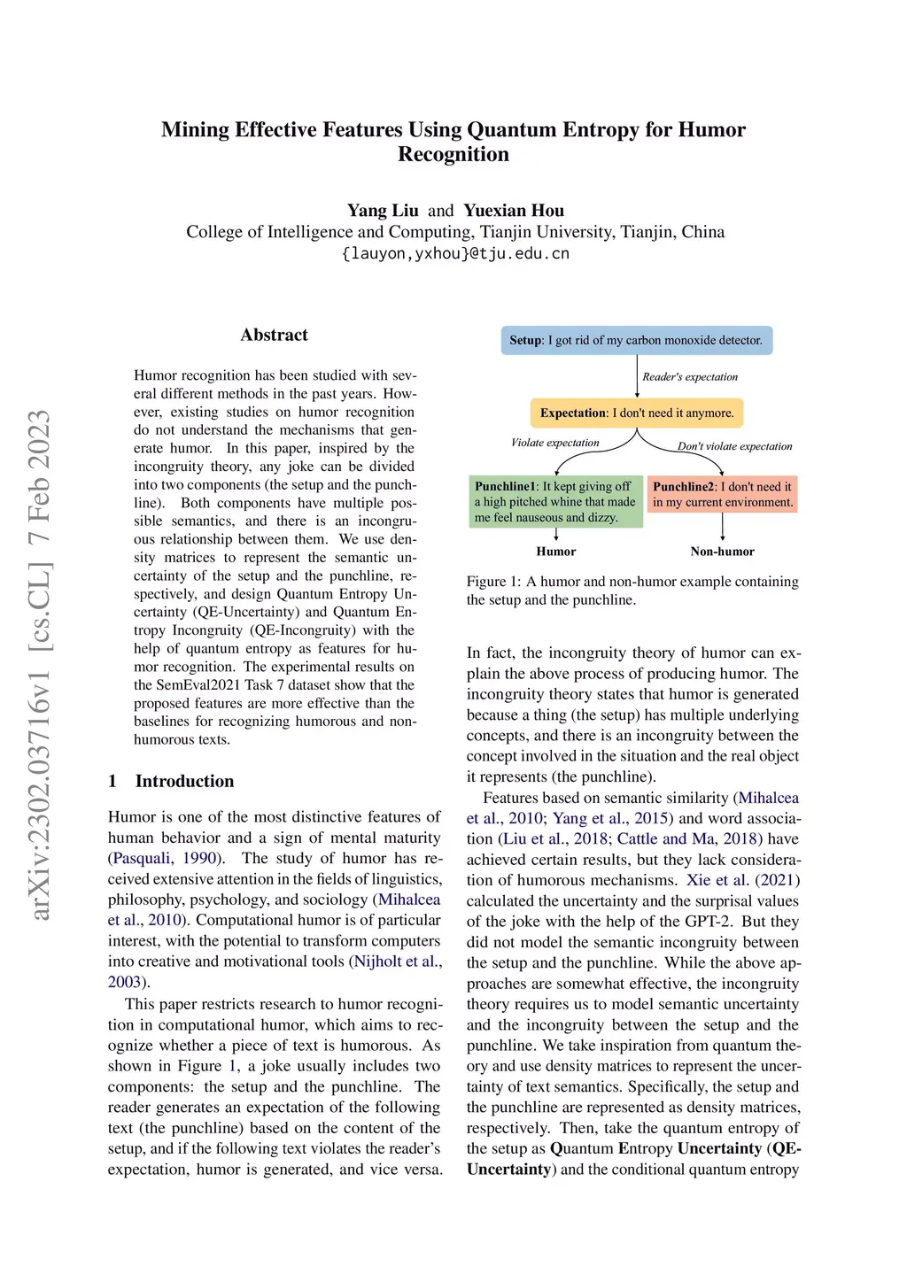 Humor recognition has been extensively studied with different methods in the past years. However, existing studies on humor recognition do not understand the mechanisms that generate humor. In this paper, inspired by the incongruity theory, any joke can be divided into two components (the setup and the punchline). Both components have multiple possible semantics, and there is an incongruous relationship between them. We use density matrices to represent the semantic uncertainty of the setup and the punchline, respectively, and design QE-Uncertainty and QE-Incongruity with the help of quantum entropy as features for humor recognition. The experimental results on the SemEval2021 Task 7 dataset show that the proposed features are more effective than the baselines for recognizing humorous and non-humorous texts.