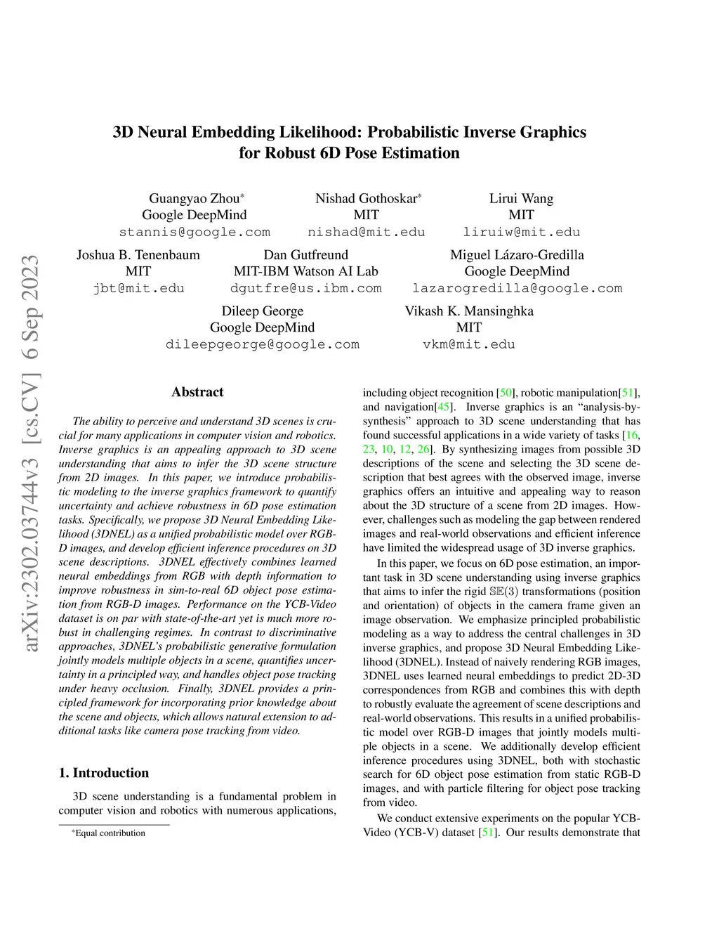 The ability to perceive and understand 3D scenes is crucial for many applications in computer vision and robotics. Inverse graphics is an appealing approach to 3D scene understanding that aims to infer the 3D scene structure from 2D images. In this paper, we introduce probabilistic modeling to the inverse graphics framework to quantify uncertainty and achieve robustness in 6D pose estimation tasks. Specifically, we propose 3D Neural Embedding Likelihood (3DNEL) as a unified probabilistic model over RGB-D images, and develop efficient inference procedures on 3D scene descriptions. 3DNEL effectively combines learned neural embeddings from RGB with depth information to improve robustness in sim-to-real 6D object pose estimation from RGB-D images. Performance on the YCB-Video dataset is on par with state-of-the-art yet is much more robust in challenging regimes. In contrast to discriminative approaches, 3DNEL's probabilistic generative formulation jointly models multiple objects in a scene, quantifies uncertainty in a principled way, and handles object pose tracking under heavy occlusion. Finally, 3DNEL provides a principled framework for incorporating prior knowledge about the scene and objects, which allows natural extension to additional tasks like camera pose tracking from video.