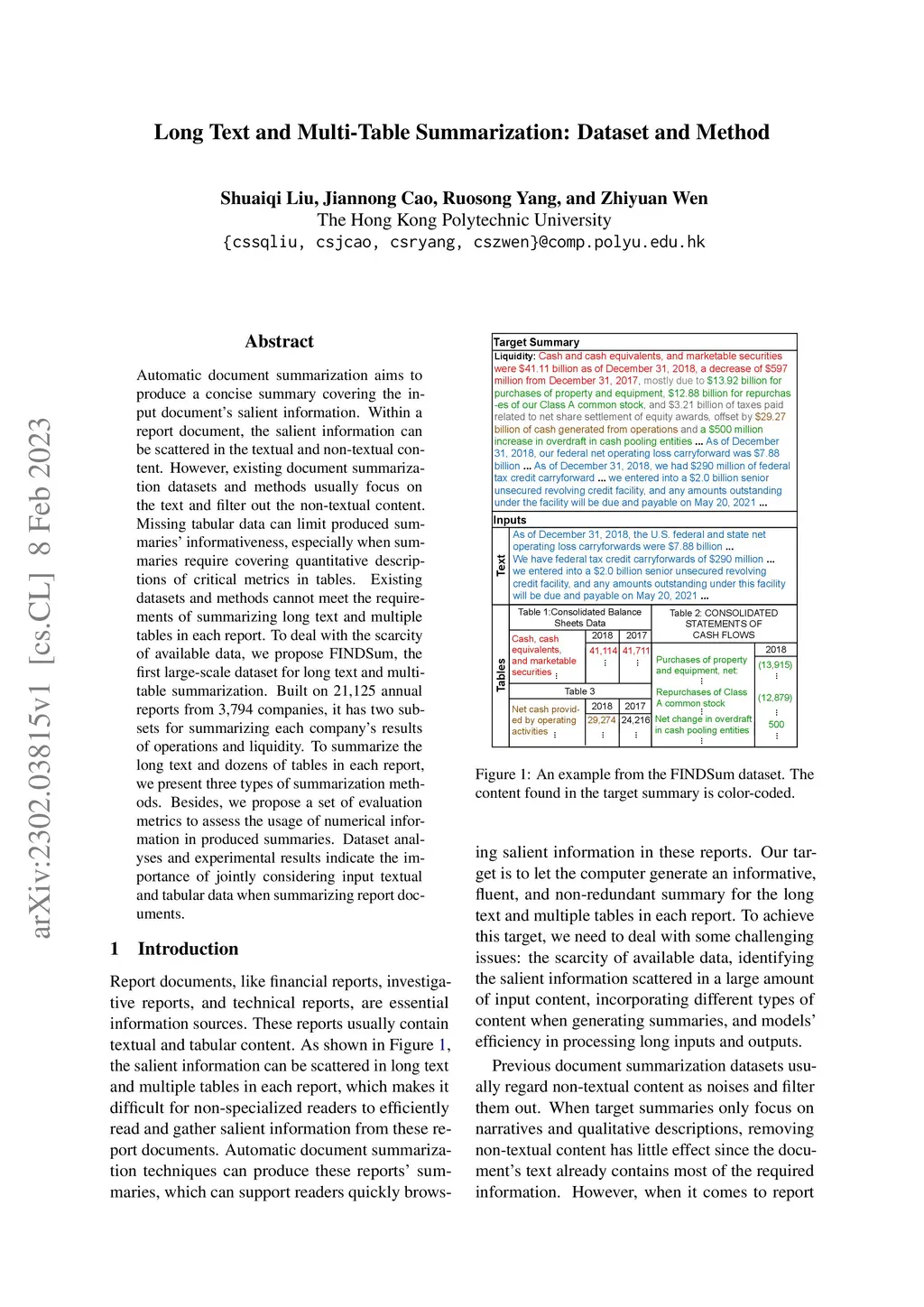 Automatic document summarization aims to produce a concise summary covering the input document's salient information. Within a report document, the salient information can be scattered in the textual and non-textual content. However, existing document summarization datasets and methods usually focus on the text and filter out the non-textual content. Missing tabular data can limit produced summaries' informativeness, especially when summaries require covering quantitative descriptions of critical metrics in tables. Existing datasets and methods cannot meet the requirements of summarizing long text and multiple tables in each report. To deal with the scarcity of available data, we propose FINDSum, the first large-scale dataset for long text and multi-table summarization. Built on 21,125 annual reports from 3,794 companies, it has two subsets for summarizing each company's results of operations and liquidity. To summarize the long text and dozens of tables in each report, we present three types of summarization methods. Besides, we propose a set of evaluation metrics to assess the usage of numerical information in produced summaries. Dataset analyses and experimental results indicate the importance of jointly considering input textual and tabular data when summarizing report documents.