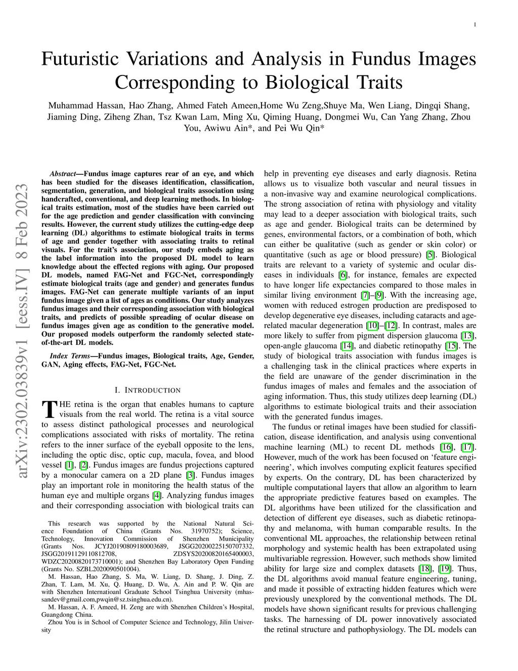 Fundus image captures rear of an eye, and which has been studied for the diseases identification, classification, segmentation, generation, and biological traits association using handcrafted, conventional, and deep learning methods. In biological traits estimation, most of the studies have been carried out for the age prediction and gender classification with convincing results. However, the current study utilizes the cutting-edge deep learning (DL) algorithms to estimate biological traits in terms of age and gender together with associating traits to retinal visuals. For the traits association, our study embeds aging as the label information into the proposed DL model to learn knowledge about the effected regions with aging. Our proposed DL models, named FAG-Net and FGC-Net, correspondingly estimate biological traits (age and gender) and generates fundus images. FAG-Net can generate multiple variants of an input fundus image given a list of ages as conditions. Our study analyzes fundus images and their corresponding association with biological traits, and predicts of possible spreading of ocular disease on fundus images given age as condition to the generative model. Our proposed models outperform the randomly selected state of-the-art DL models.