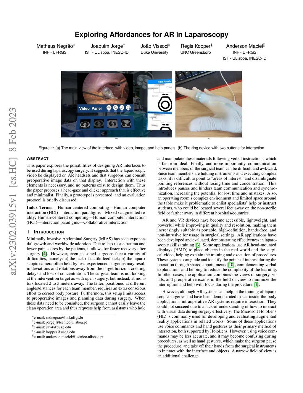 This paper explores the possibilities of designing AR interfaces to be used during laparoscopy surgery. It suggests that the laparoscopic video be displayed on AR headsets and that surgeons can consult preoperative image data on that display. Interaction with these elements is necessary, and no patterns exist to design them. Thus the paper proposes a head-gaze and clicker approach that is effective and minimalist. Finally, a prototype is presented, and an evaluation protocol is briefly discussed.