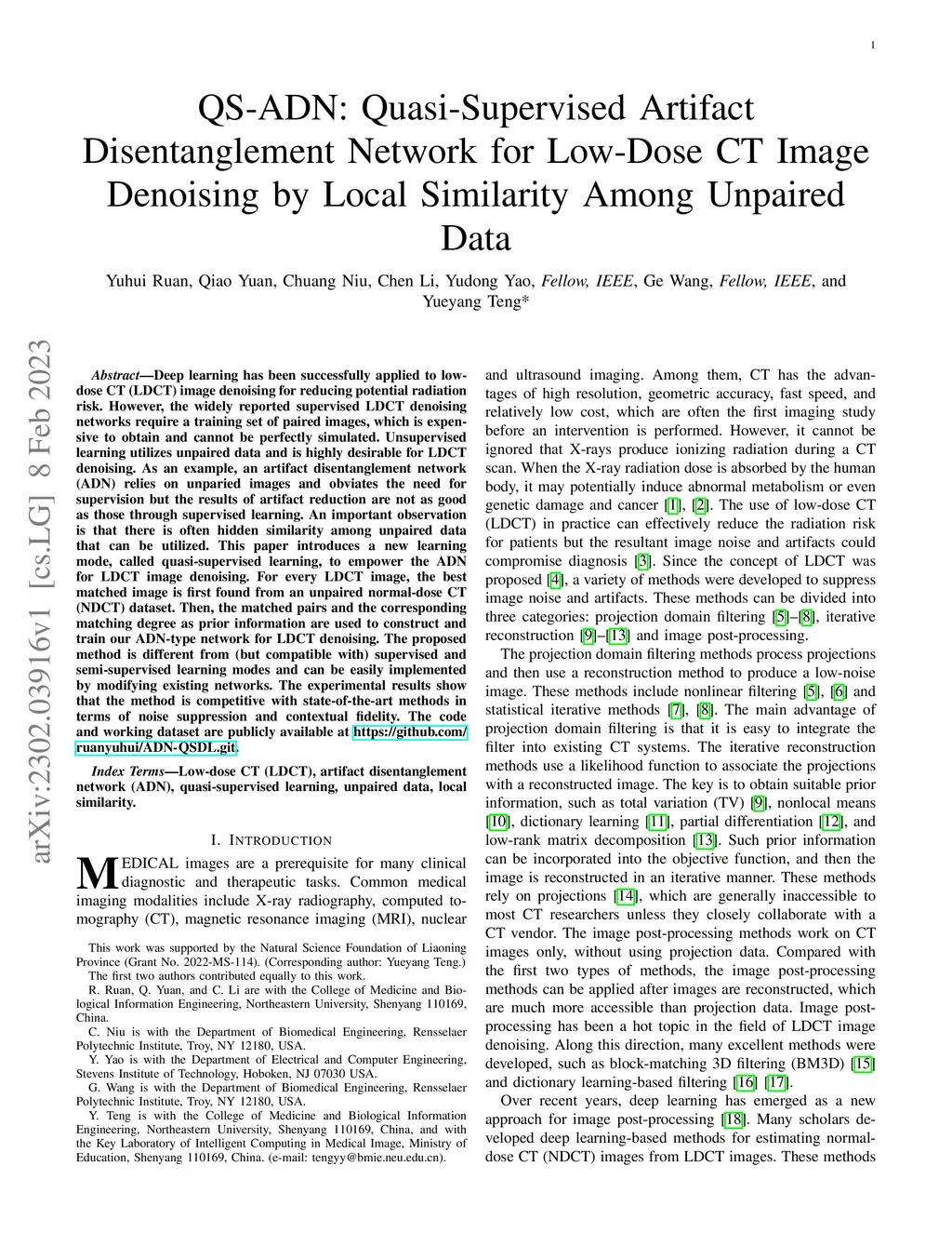 QS-ADN: Quasi-Supervised Artifact Disentanglement Network for Low-Dose