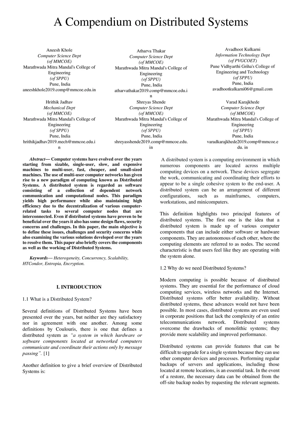 Computer systems have evolved over the years starting from sizable, single-user, slow, and expensive machines to multi-user, fast, cheaper, and small-sized machines. The use of multi-user computer networks has given rise to a new paradigm of computing known as Distributed Systems. A distributed system is regarded as software consisting of a collection of dependent network communication and computational nodes. This paradigm yields high performance while also maintaining high efficiency due to the decentralization of various computer related tasks to several computer nodes that are interconnected. Even if distributed systems have proven to be beneficial over the years it also has some design flaws, security concerns and challenges. In this paper, the main objective is to define these issues, challenges and security concerns while also examining the various solutions developed over the years to resolve them. This paper also briefly covers the components as well as the working of Distributed Systems.