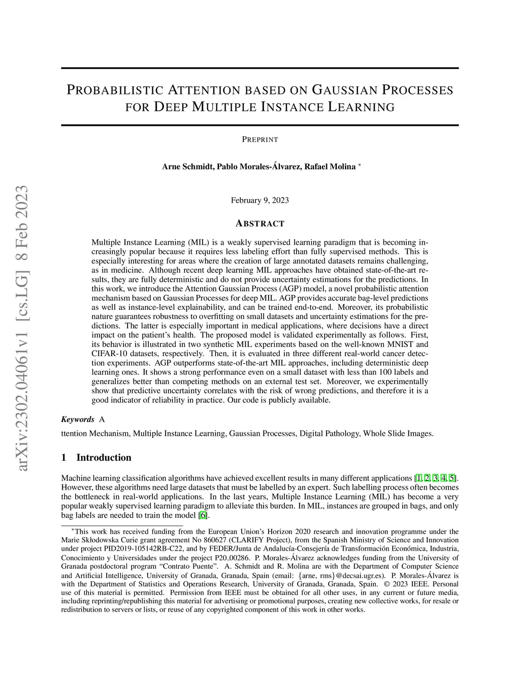 Multiple Instance Learning (MIL) is a weakly supervised learning paradigm that is becoming increasingly popular because it requires less labeling effort than fully supervised methods. This is especially interesting for areas where the creation of large annotated datasets remains challenging, as in medicine. Although recent deep learning MIL approaches have obtained state-of-the-art results, they are fully deterministic and do not provide uncertainty estimations for the predictions. In this work, we introduce the Attention Gaussian Process (AGP) model, a novel probabilistic attention mechanism based on Gaussian Processes for deep MIL. AGP provides accurate bag-level predictions as well as instance-level explainability, and can be trained end-to-end. Moreover, its probabilistic nature guarantees robustness to overfitting on small datasets and uncertainty estimations for the predictions. The latter is especially important in medical applications, where decisions have a direct impact on the patient's health. The proposed model is validated experimentally as follows. First, its behavior is illustrated in two synthetic MIL experiments based on the well-known MNIST and CIFAR-10 datasets, respectively. Then, it is evaluated in three different real-world cancer detection experiments. AGP outperforms state-of-the-art MIL approaches, including deterministic deep learning ones. It shows a strong performance even on a small dataset with less than 100 labels and generalizes better than competing methods on an external test set. Moreover, we experimentally show that predictive uncertainty correlates with the risk of wrong predictions, and therefore it is a good indicator of reliability in practice. Our code is publicly available.
