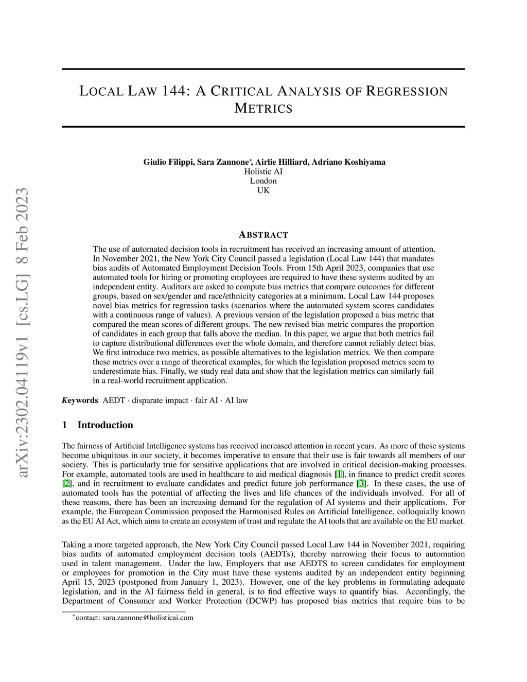 The use of automated decision tools in recruitment has received an increasing amount of attention. In November 2021, the New York City Council passed a legislation (Local Law 144) that mandates bias audits of Automated Employment Decision Tools. From 15th April 2023, companies that use automated tools for hiring or promoting employees are required to have these systems audited by an independent entity. Auditors are asked to compute bias metrics that compare outcomes for different groups, based on sex/gender and race/ethnicity categories at a minimum. Local Law 144 proposes novel bias metrics for regression tasks (scenarios where the automated system scores candidates with a continuous range of values). A previous version of the legislation proposed a bias metric that compared the mean scores of different groups. The new revised bias metric compares the proportion of candidates in each group that falls above the median. In this paper, we argue that both metrics fail to capture distributional differences over the whole domain, and therefore cannot reliably detect bias. We first introduce two metrics, as possible alternatives to the legislation metrics. We then compare these metrics over a range of theoretical examples, for which the legislation proposed metrics seem to underestimate bias. Finally, we study real data and show that the legislation metrics can similarly fail in a real-world recruitment application.