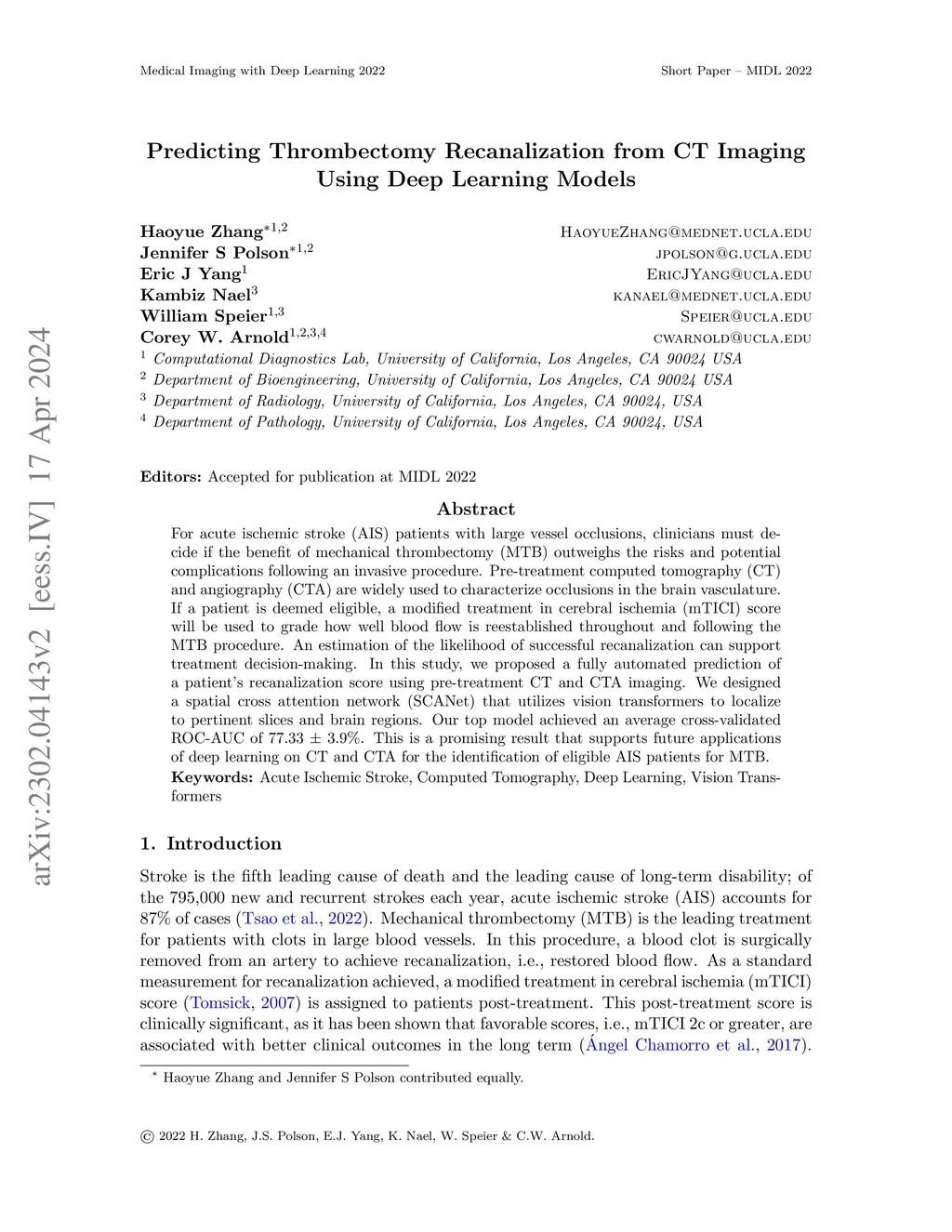 For acute ischemic stroke (AIS) patients with large vessel occlusions, clinicians must decide if the benefit of mechanical thrombectomy (MTB) outweighs the risks and potential complications following an invasive procedure. Pre-treatment computed tomography (CT) and angiography (CTA) are widely used to characterize occlusions in the brain vasculature. If a patient is deemed eligible, a modified treatment in cerebral ischemia (mTICI) score will be used to grade how well blood flow is reestablished throughout and following the MTB procedure. An estimation of the likelihood of successful recanalization can support treatment decision-making. In this study, we proposed a fully automated prediction of a patient's recanalization score using pre-treatment CT and CTA imaging. We designed a spatial cross attention network (SCANet) that utilizes vision transformers to localize to pertinent slices and brain regions. Our top model achieved an average cross-validated ROC-AUC of 77.33 3.9\%. This is a promising result that supports future applications of deep learning on CT and CTA for the identification of eligible AIS patients for MTB.