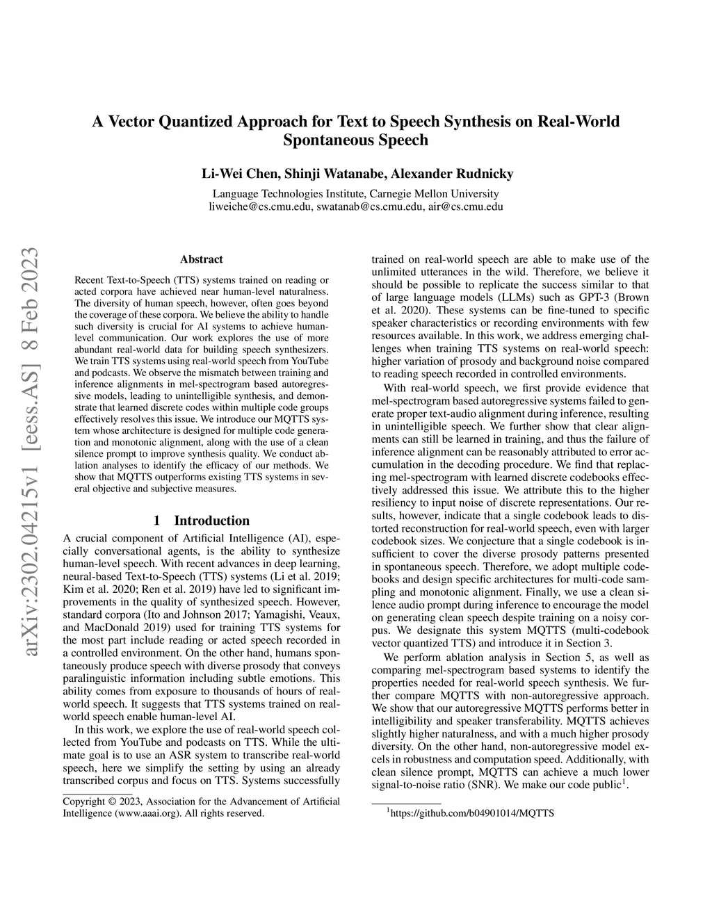 Recent Text-to-Speech (TTS) systems trained on reading or acted corpora have achieved near human-level naturalness. The diversity of human speech, however, often goes beyond the coverage of these corpora. We believe the ability to handle such diversity is crucial for AI systems to achieve human-level communication. Our work explores the use of more abundant real-world data for building speech synthesizers. We train TTS systems using real-world speech from YouTube and podcasts. We observe the mismatch between training and inference alignments in mel-spectrogram based autoregressive models, leading to unintelligible synthesis, and demonstrate that learned discrete codes within multiple code groups effectively resolves this issue. We introduce our MQTTS system whose architecture is designed for multiple code generation and monotonic alignment, along with the use of a clean silence prompt to improve synthesis quality. We conduct ablation analyses to identify the efficacy of our methods. We show that MQTTS outperforms existing TTS systems in several objective and subjective measures.