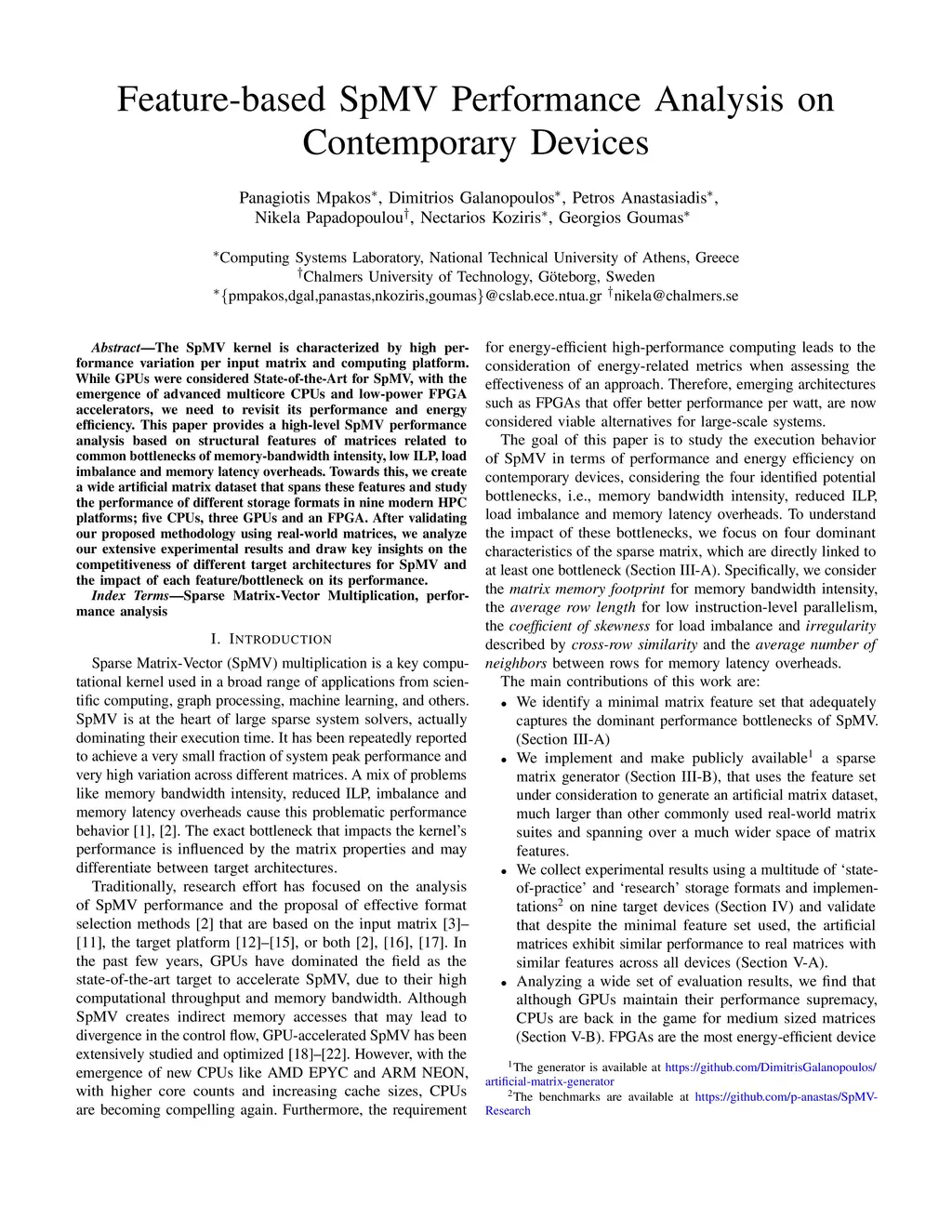 The SpMV kernel is characterized by high performance variation per input matrix and computing platform. While GPUs were considered State-of-the-Art for SpMV, with the emergence of advanced multicore CPUs and low-power FPGA accelerators, we need to revisit its performance and energy efficiency. This paper provides a high-level SpMV performance analysis based on structural features of matrices related to common bottlenecks of memory-bandwidth intensity, low ILP, load imbalance and memory latency overheads. Towards this, we create a wide artificial matrix dataset that spans these features and study the performance of different storage formats in nine modern HPC platforms; five CPUs, three GPUs and an FPGA. After validating our proposed methodology using real-world matrices, we analyze our extensive experimental results and draw key insights on the competitiveness of different target architectures for SpMV and the impact of each feature/bottleneck on its performance.