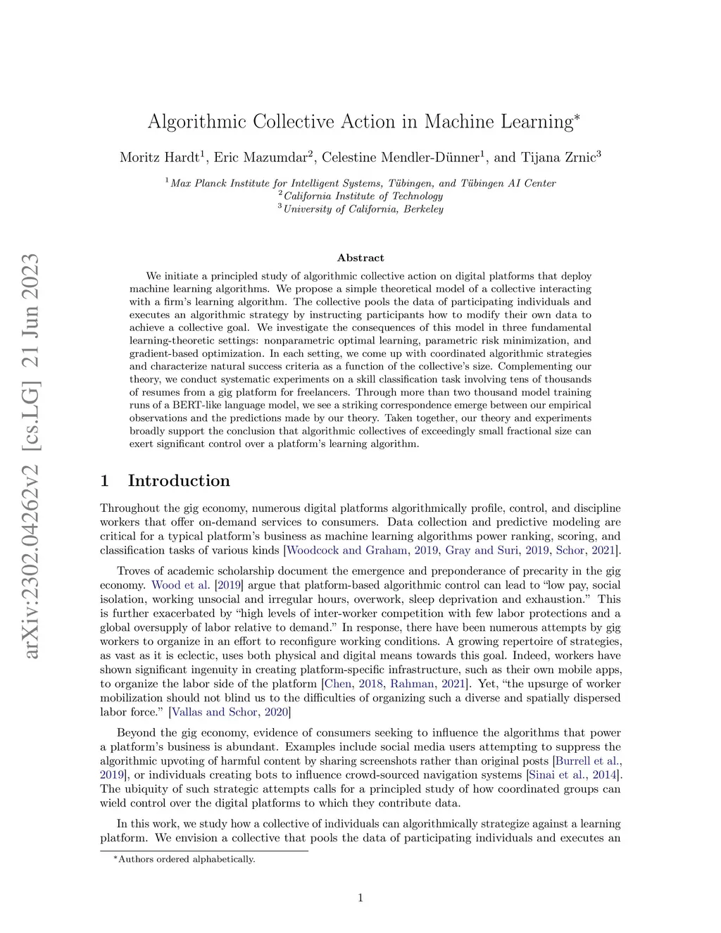 We initiate a principled study of algorithmic collective action on digital platforms that deploy machine learning algorithms. We propose a simple theoretical model of a collective interacting with a firm's learning algorithm. The collective pools the data of participating individuals and executes an algorithmic strategy by instructing participants how to modify their own data to achieve a collective goal. We investigate the consequences of this model in three fundamental learning-theoretic settings: the case of a nonparametric optimal learning algorithm, a parametric risk minimizer, and gradient-based optimization. In each setting, we come up with coordinated algorithmic strategies and characterize natural success criteria as a function of the collective's size. Complementing our theory, we conduct systematic experiments on a skill classification task involving tens of thousands of resumes from a gig platform for freelancers. Through more than two thousand model training runs of a BERT-like language model, we see a striking correspondence emerge between our empirical observations and the predictions made by our theory. Taken together, our theory and experiments broadly support the conclusion that algorithmic collectives of exceedingly small fractional size can exert significant control over a platform's learning algorithm.