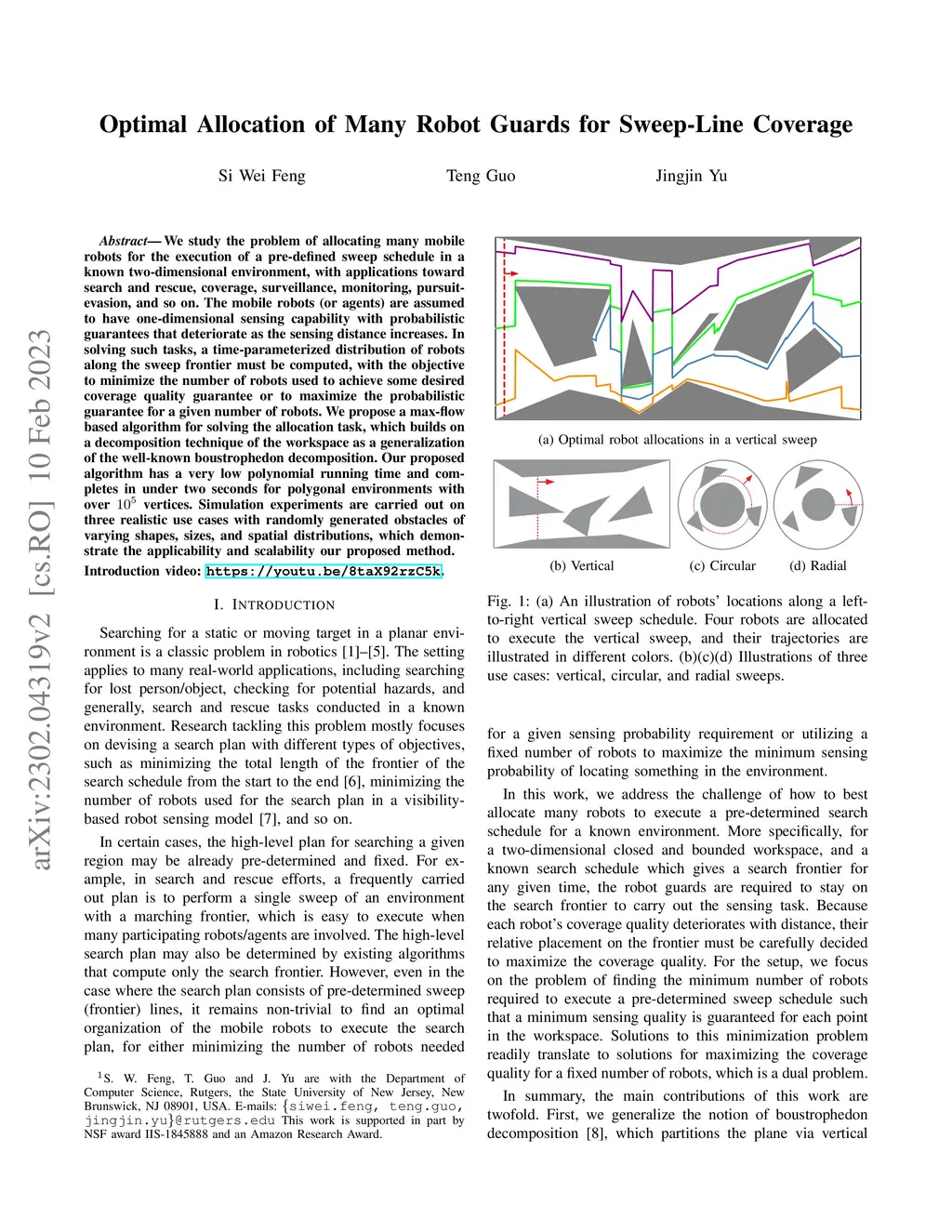 We study the problem of allocating many mobile robots for the execution of a pre-defined sweep schedule in a known two-dimensional environment, with applications toward search and rescue, coverage, surveillance, monitoring, pursuit-evasion, and so on. The mobile robots (or agents) are assumed to have one-dimensional sensing capability with probabilistic guarantees that deteriorate as the sensing distance increases. In solving such tasks, a time-parameterized distribution of robots along the sweep frontier must be computed, with the objective to minimize the number of robots used to achieve some desired coverage quality guarantee or to maximize the probabilistic guarantee for a given number of robots. We propose a max-flow based algorithm for solving the allocation task, which builds on a decomposition technique of the workspace as a generalization of the well-known boustrophedon decomposition. Our proposed algorithm has a very low polynomial running time and completes in under two seconds for polygonal environments with over vertices. Simulation experiments are carried out on three realistic use cases with randomly generated obstacles of varying shapes, sizes, and spatial distributions, which demonstrate the applicability and scalability our proposed method.