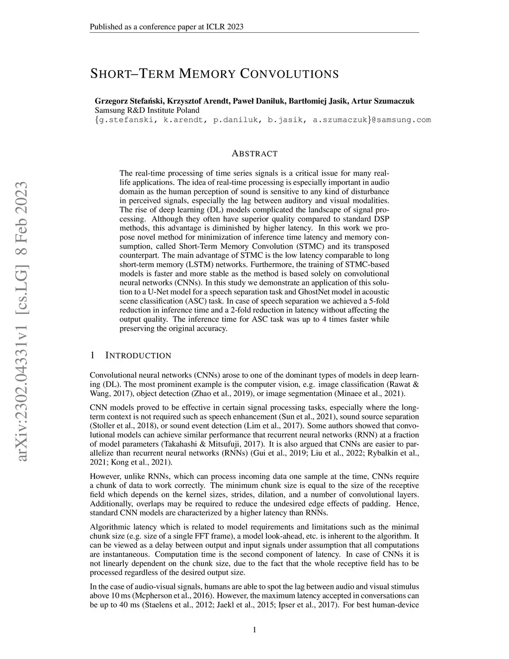 The real-time processing of time series signals is a critical issue for many real-life applications. The idea of real-time processing is especially important in audio domain as the human perception of sound is sensitive to any kind of disturbance in perceived signals, especially the lag between auditory and visual modalities. The rise of deep learning (DL) models complicated the landscape of signal processing. Although they often have superior quality compared to standard DSP methods, this advantage is diminished by higher latency. In this work we propose novel method for minimization of inference time latency and memory consumption, called Short-Term Memory Convolution (STMC) and its transposed counterpart. The main advantage of STMC is the low latency comparable to long short-term memory (LSTM) networks. Furthermore, the training of STMC-based models is faster and more stable as the method is based solely on convolutional neural networks (CNNs). In this study we demonstrate an application of this solution to a U-Net model for a speech separation task and GhostNet model in acoustic scene classification (ASC) task. In case of speech separation we achieved a 5-fold reduction in inference time and a 2-fold reduction in latency without affecting the output quality. The inference time for ASC task was up to 4 times faster while preserving the original accuracy.