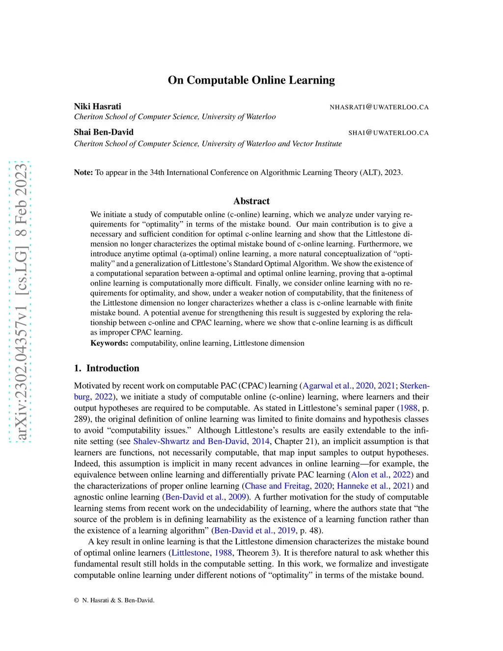 We initiate a study of computable online (c-online) learning, which we analyze under varying requirements for "optimality" in terms of the mistake bound. Our main contribution is to give a necessary and sufficient condition for optimal c-online learning and show that the Littlestone dimension no longer characterizes the optimal mistake bound of c-online learning. Furthermore, we introduce anytime optimal (a-optimal) online learning, a more natural conceptualization of "optimality" and a generalization of Littlestone's Standard Optimal Algorithm. We show the existence of a computational separation between a-optimal and optimal online learning, proving that a-optimal online learning is computationally more difficult. Finally, we consider online learning with no requirements for optimality, and show, under a weaker notion of computability, that the finiteness of the Littlestone dimension no longer characterizes whether a class is c-online learnable with finite mistake bound. A potential avenue for strengthening this result is suggested by exploring the relationship between c-online and CPAC learning, where we show that c-online learning is as difficult as improper CPAC learning.