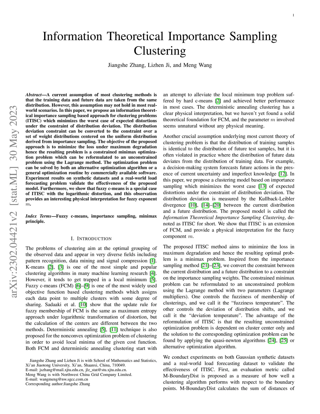 A current assumption of most clustering methods is that the training data and future data are taken from the same distribution. However, this assumption may not hold in most real-world scenarios. In this paper, we propose an information theoretical importance sampling based approach for clustering problems (ITISC) which minimizes the worst case of expected distortions under the constraint of distribution deviation. The distribution deviation constraint can be converted to the constraint over a set of weight distributions centered on the uniform distribution derived from importance sampling. The objective of the proposed approach is to minimize the loss under maximum degradation hence the resulting problem is a constrained minimax optimization problem which can be reformulated to an unconstrained problem using the Lagrange method. The optimization problem can be solved by both an alternative optimization algorithm or a general optimization routine by commercially available software. Experiment results on synthetic datasets and a real-world load forecasting problem validate the effectiveness of the proposed model. Furthermore, we show that fuzzy c-means is a special case of ITISC with the logarithmic distortion, and this observation provides an interesting physical interpretation for fuzzy exponent .