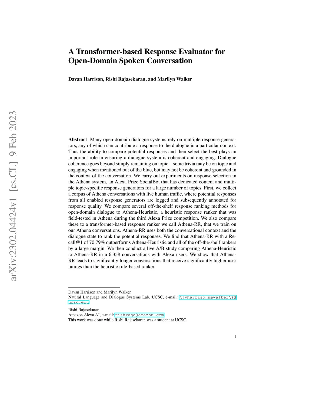 Many open-domain dialogue systems rely on multiple response generators, any of which can contribute a response to the dialogue in a particular context. Thus the ability to compare potential responses and then select the best plays an important role in ensuring a dialogue system is coherent and engaging. Dialogue coherence goes beyond simply remaining on topic -- some trivia may be on topic and engaging when mentioned out of the blue, but may not be coherent and grounded in the context of the conversation. We carry out experiments on response selection in the Athena system, an Alexa Prize SocialBot that has dedicated content and multiple topic-specific response generators for a large number of topics. First, we collect a corpus of Athena conversations with live human traffic, where potential responses from all enabled response generators are logged and subsequently annotated for response quality. We compare several off-the-shelf response ranking methods for open-domain dialogue to Athena-Heuristic, a heuristic response ranker that was field-tested in Athena during the third Alexa Prize competition. We also compare these to a transformer-based response ranker we call Athena-RR, that we train on our Athena conversations. Athena-RR uses both the conversational context and the dialogue state to rank the potential responses. We find that Athena-RR with a Recall@1 of 70.79\% outperforms Athena-Heuristic and all of the off-the-shelf rankers by a large margin. We then conduct a live A/B study comparing Athena-Heuristic to Athena-RR in a 6,358 conversations with Alexa users. We show that Athena-RR leads to significantly longer conversations that receive significantly higher user ratings than the heuristic rule-based ranker.