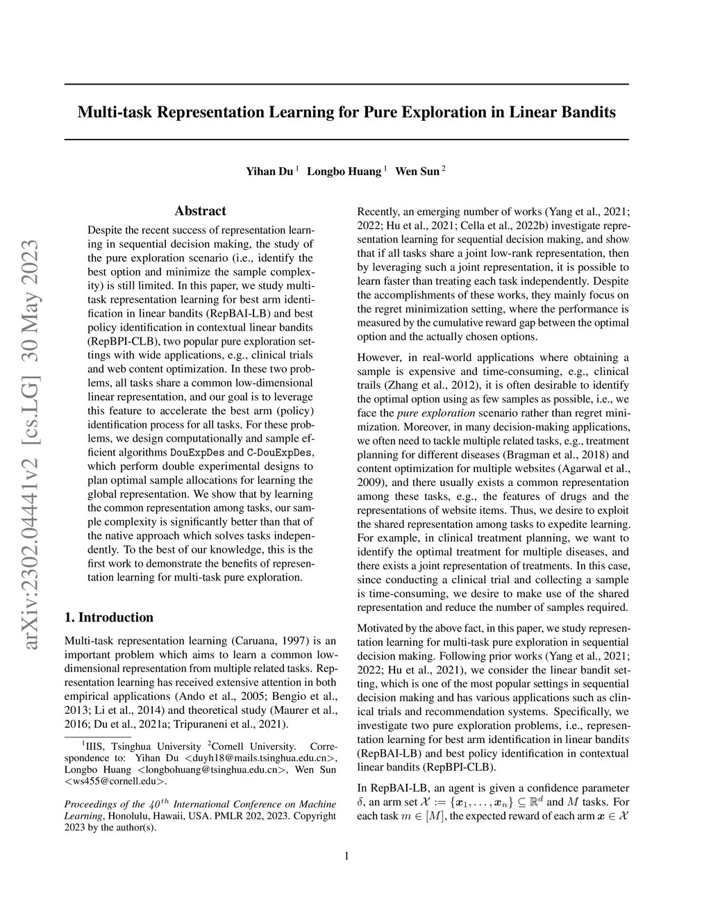 Despite the recent success of representation learning in sequential decision making, the study of the pure exploration scenario (i.e., identify the best option and minimize the sample complexity) is still limited. In this paper, we study multi-task representation learning for best arm identification in linear bandits (RepBAI-LB) and best policy identification in contextual linear bandits (RepBPI-CLB), two popular pure exploration settings with wide applications, e.g., clinical trials and web content optimization. In these two problems, all tasks share a common low-dimensional linear representation, and our goal is to leverage this feature to accelerate the best arm (policy) identification process for all tasks. For these problems, we design computationally and sample efficient algorithms DouExpDes and C-DouExpDes, which perform double experimental designs to plan optimal sample allocations for learning the global representation. We show that by learning the common representation among tasks, our sample complexity is significantly better than that of the native approach which solves tasks independently. To the best of our knowledge, this is the first work to demonstrate the benefits of representation learning for multi-task pure exploration.