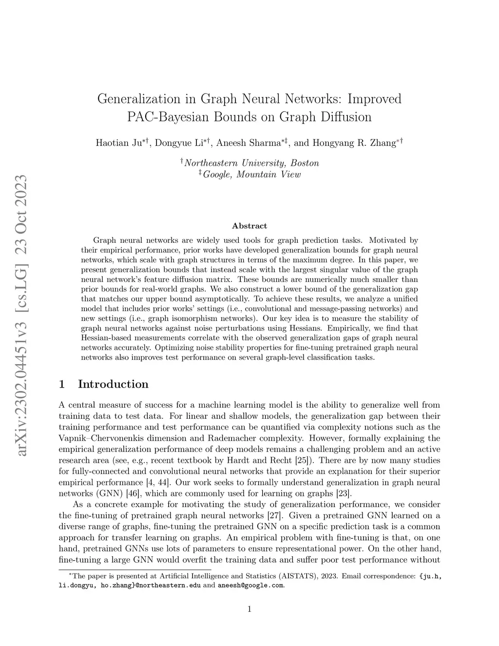 Graph neural networks are widely used tools for graph prediction tasks. Motivated by their empirical performance, prior works have developed generalization bounds for graph neural networks, which scale with graph structures in terms of the maximum degree. In this paper, we present generalization bounds that instead scale with the largest singular value of the graph neural network's feature diffusion matrix. These bounds are numerically much smaller than prior bounds for real-world graphs. We also construct a lower bound of the generalization gap that matches our upper bound asymptotically. To achieve these results, we analyze a unified model that includes prior works' settings (i.e., convolutional and message-passing networks) and new settings (i.e., graph isomorphism networks). Our key idea is to measure the stability of graph neural networks against noise perturbations using Hessians. Empirically, we find that Hessian-based measurements correlate with the observed generalization gaps of graph neural networks accurately. Optimizing noise stability properties for fine-tuning pretrained graph neural networks also improves test performance on several graph-level classification tasks.