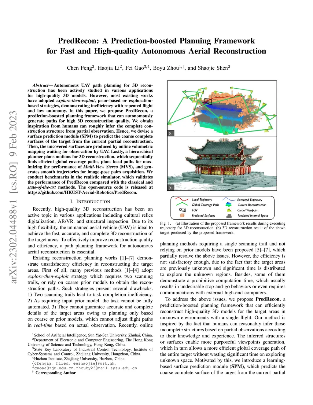 Autonomous UAV path planning for 3D reconstruction has been actively studied in various applications for high-quality 3D models. However, most existing works have adopted explore-then-exploit, prior-based or exploration-based strategies, demonstrating inefficiency with repeated flight and low autonomy. In this paper, we propose PredRecon, a prediction-boosted planning framework that can autonomously generate paths for high 3D reconstruction quality. We obtain inspiration from humans can roughly infer the complete construction structure from partial observation. Hence, we devise a surface prediction module (SPM) to predict the coarse complete surfaces of the target from the current partial reconstruction. Then, the uncovered surfaces are produced by online volumetric mapping waiting for observation by UAV. Lastly, a hierarchical planner plans motions for 3D reconstruction, which sequentially finds efficient global coverage paths, plans local paths for maximizing the performance of Multi-View Stereo (MVS), and generates smooth trajectories for image-pose pairs acquisition. We conduct benchmarks in the realistic simulator, which validates the performance of PredRecon compared with the classical and state-of-the-art methods. The open-source code is released at https://github.com/HKUST-Aerial-Robotics/PredRecon.