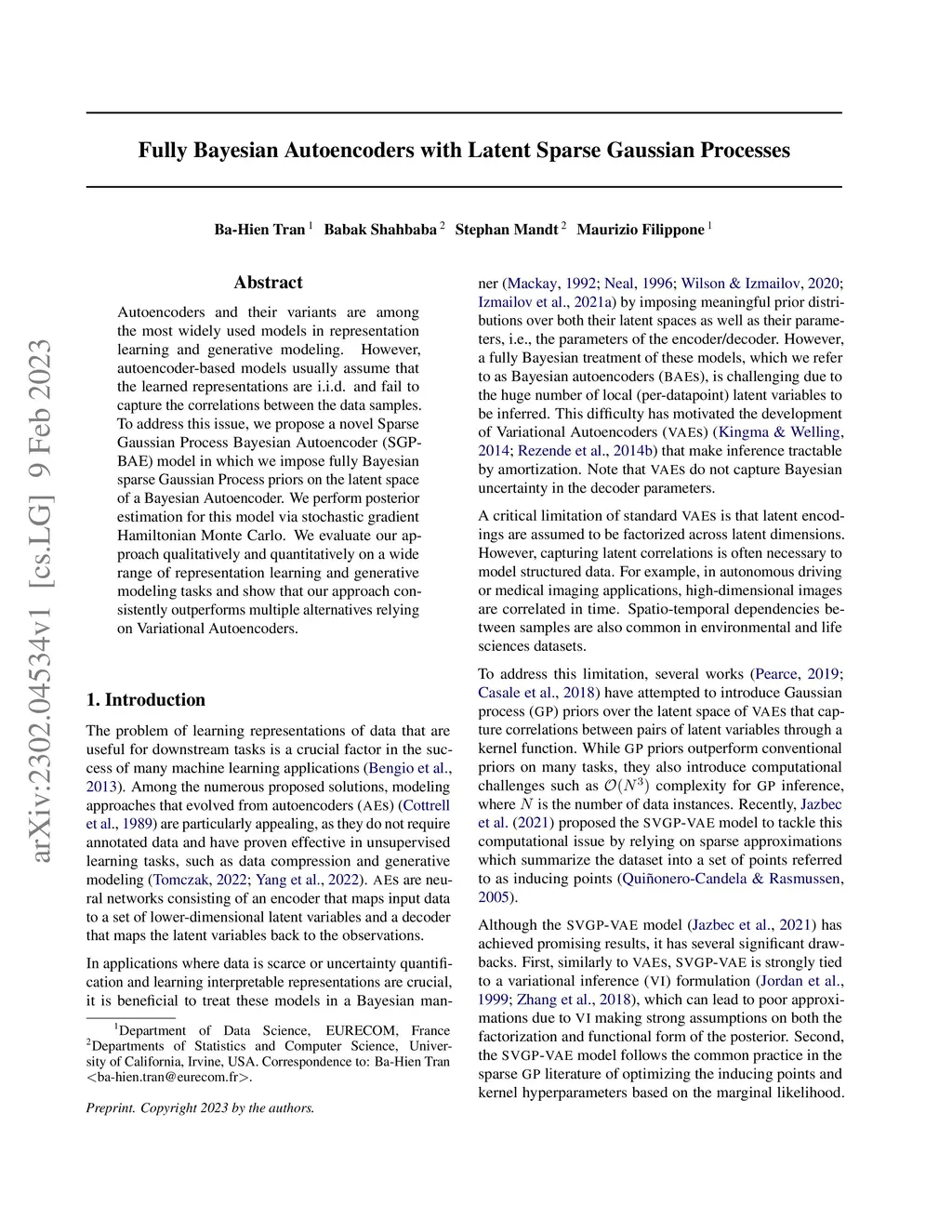 Autoencoders and their variants are among the most widely used models in representation learning and generative modeling. However, autoencoder-based models usually assume that the learned representations are i.i.d. and fail to capture the correlations between the data samples. To address this issue, we propose a novel Sparse Gaussian Process Bayesian Autoencoder (SGPBAE) model in which we impose fully Bayesian sparse Gaussian Process priors on the latent space of a Bayesian Autoencoder. We perform posterior estimation for this model via stochastic gradient Hamiltonian Monte Carlo. We evaluate our approach qualitatively and quantitatively on a wide range of representation learning and generative modeling tasks and show that our approach consistently outperforms multiple alternatives relying on Variational Autoencoders.