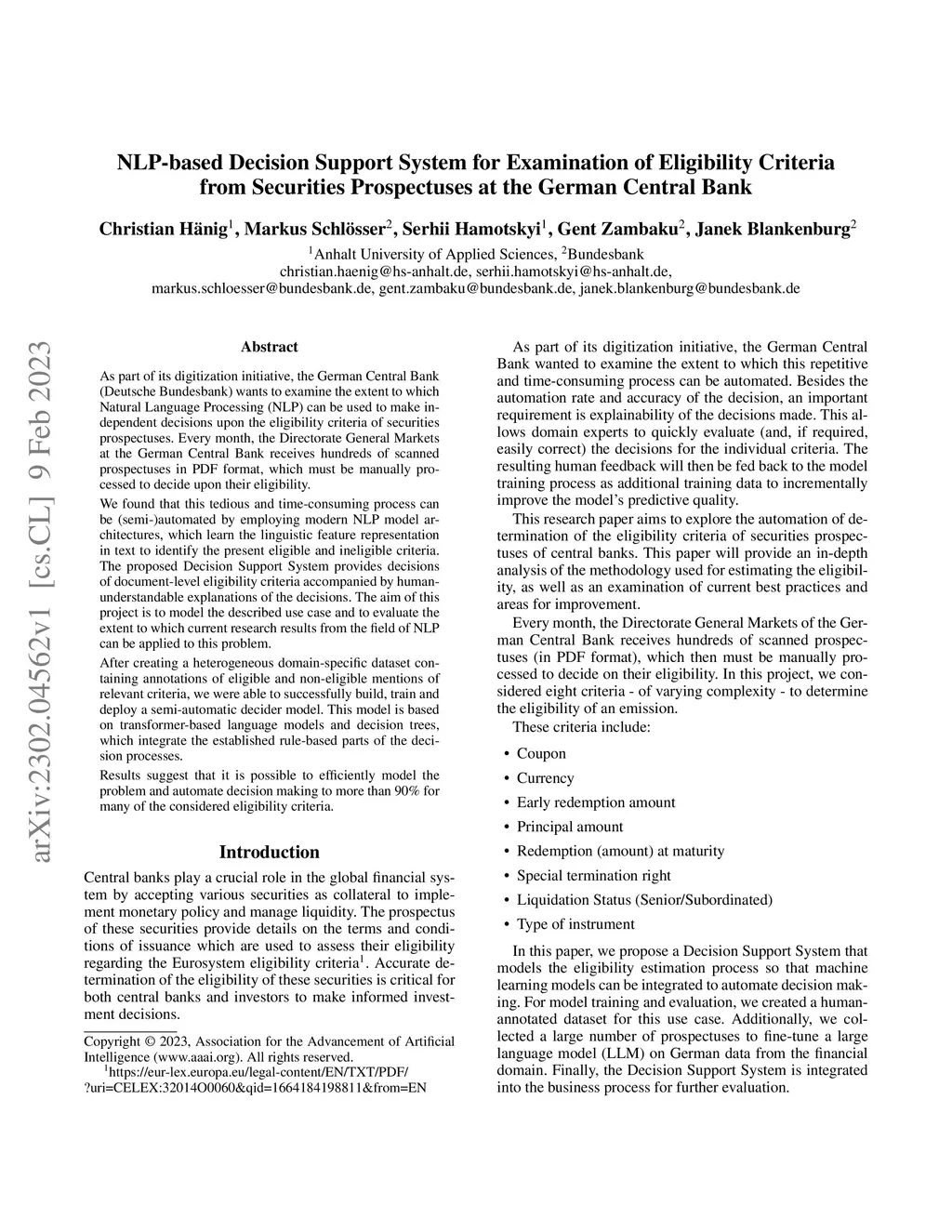 As part of its digitization initiative, the German Central Bank (Deutsche Bundesbank) wants to examine the extent to which natural Language Processing (NLP) can be used to make independent decisions upon the eligibility criteria of securities prospectuses. Every month, the Directorate General Markets at the German Central Bank receives hundreds of scanned prospectuses in PDF format, which must be manually processed to decide upon their eligibility. We found that this tedious and time-consuming process can be (semi-)automated by employing modern NLP model architectures, which learn the linguistic feature representation in text to identify the present eligible and ineligible criteria. The proposed Decision Support System provides decisions of document-level eligibility criteria accompanied by human-understandable explanations of the decisions. The aim of this project is to model the described use case and to evaluate the extent to which current research results from the field of NLP can be applied to this problem. After creating a heterogeneous domain-specific dataset containing annotations of eligible and non-eligible mentions of relevant criteria, we were able to successfully build, train and deploy a semi-automatic decider model. This model is based on transformer-based language models and decision trees, which integrate the established rule-based parts of the decision processes. Results suggest that it is possible to efficiently model the problem and automate decision making to more than 90% for many of the considered eligibility criteria.