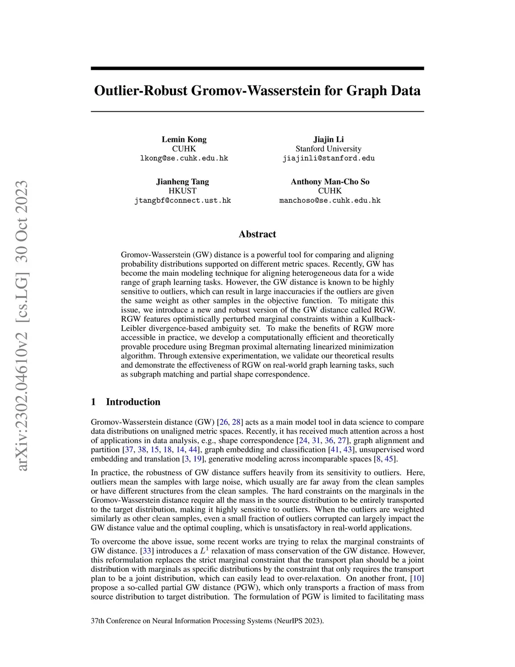 Gromov-Wasserstein (GW) distance is a powerful tool for comparing and aligning probability distributions supported on different metric spaces. Recently, GW has become the main modeling technique for aligning heterogeneous data for a wide range of graph learning tasks. However, the GW distance is known to be highly sensitive to outliers, which can result in large inaccuracies if the outliers are given the same weight as other samples in the objective function. To mitigate this issue, we introduce a new and robust version of the GW distance called RGW. RGW features optimistically perturbed marginal constraints within a Kullback-Leibler divergence-based ambiguity set. To make the benefits of RGW more accessible in practice, we develop a computationally efficient and theoretically provable procedure using Bregman proximal alternating linearized minimization algorithm. Through extensive experimentation, we validate our theoretical results and demonstrate the effectiveness of RGW on real-world graph learning tasks, such as subgraph matching and partial shape correspondence.