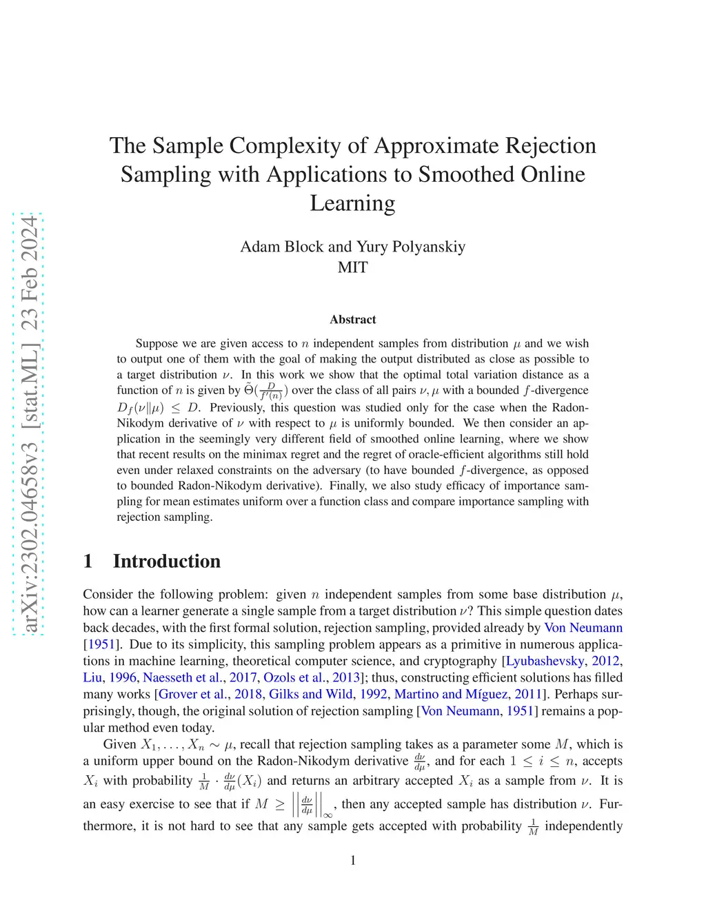 Suppose we are given access to nn independent samples from distribution μ\mu and we wish to output one of them with the goal of making the output distributed as close as possible to a target distribution ν\nu. In this work we show that the optimal total variation distance as a function of nn is given by Θ~(Df(n))\tilde\Theta(\frac{D}{f'(n)}) over the class of all pairs ν,μ\nu,\mu with a bounded ff-divergence Df(νμ)DD_f(\nu\|\mu)\leq D. Previously, this question was studied only for the case when the Radon-Nikodym derivative of ν\nu with respect to μ\mu is uniformly bounded. We then consider an application in the seemingly very different field of smoothed online learning, where we show that recent results on the minimax regret and the regret of oracle-efficient algorithms still hold even under relaxed constraints on the adversary (to have bounded ff-divergence, as opposed to bounded Radon-Nikodym derivative). Finally, we also study efficacy of importance sampling for mean estimates uniform over a function class and compare importance sampling with rejection sampling.