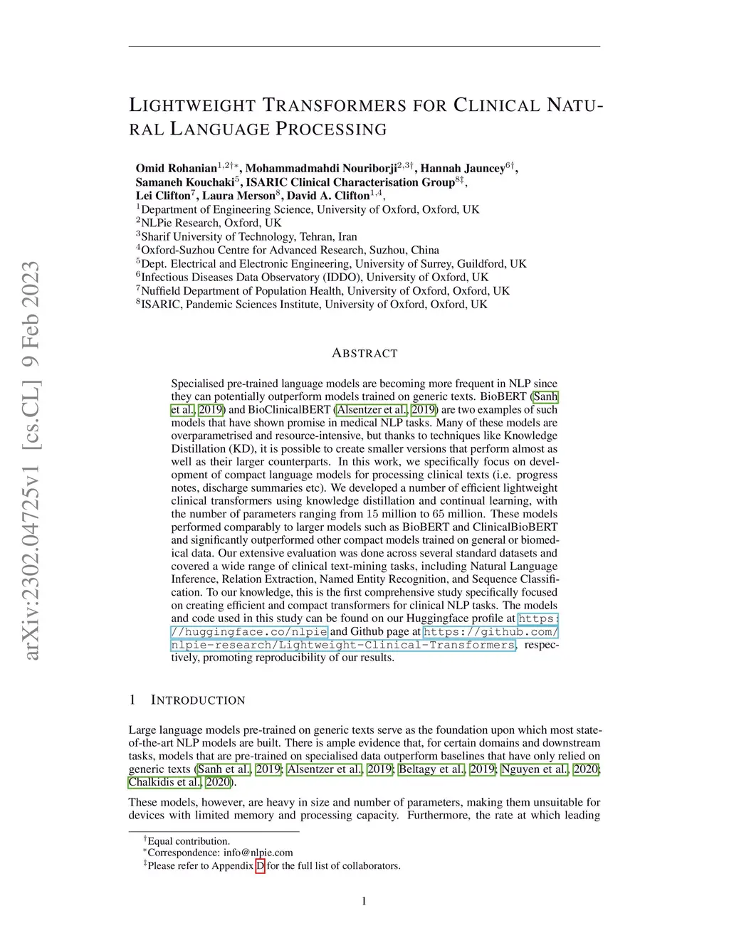Lightweight Transformers for Clinical Natural Language Processing
