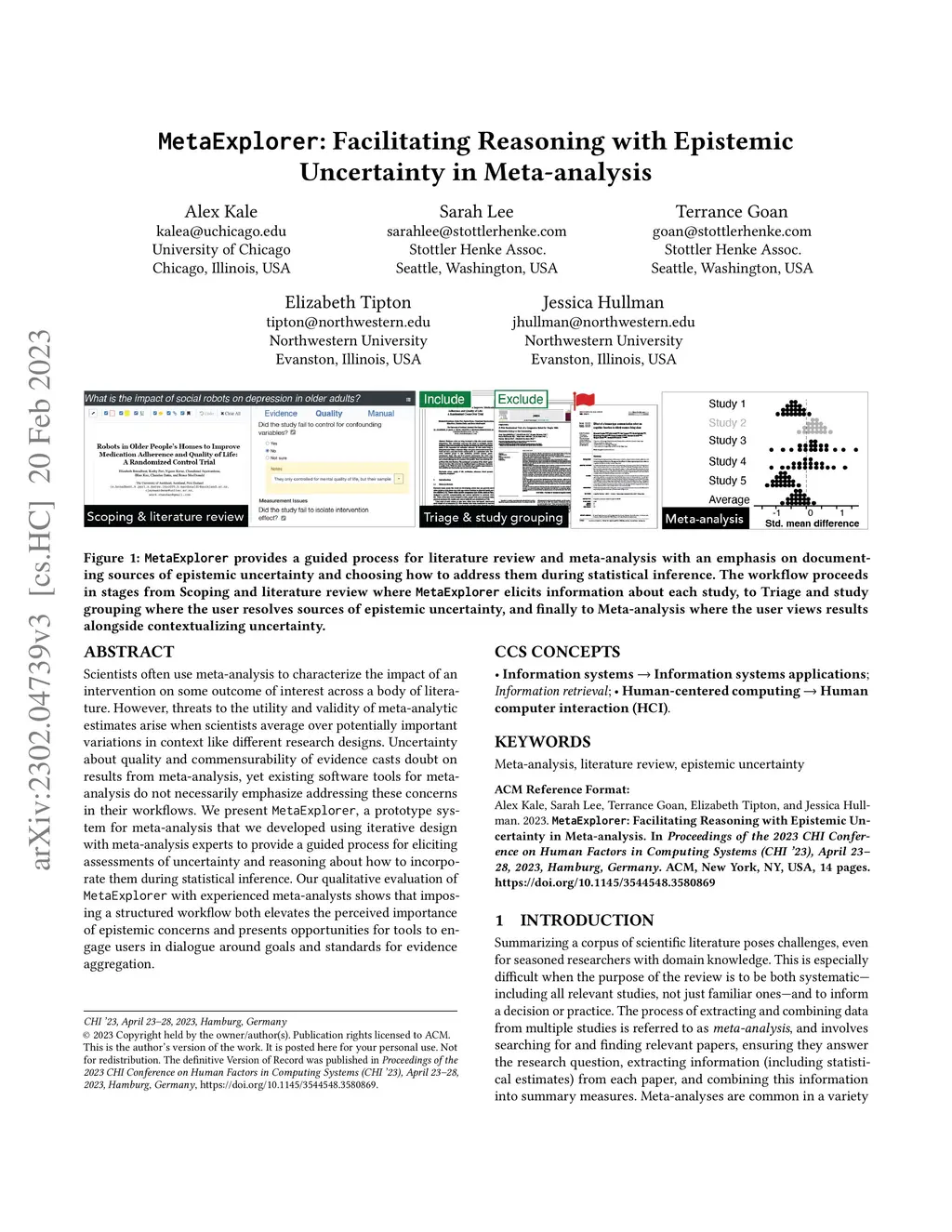 Scientists often use meta-analysis to characterize the impact of an intervention on some outcome of interest across a body of literature. However, threats to the utility and validity of meta-analytic estimates arise when scientists average over potentially important variations in context like different research designs. Uncertainty about quality and commensurability of evidence casts doubt on results from meta-analysis, yet existing software tools for meta-analysis do not provide an explicit software representation of these concerns. We present MetaExplorer, a prototype system for meta-analysis that we developed using iterative design with meta-analysis experts to provide a guided process for eliciting assessments of uncertainty and reasoning about how to incorporate them during statistical inference. Our qualitative evaluation of MetaExplorer with experienced meta-analysts shows that imposing a structured workflow both elevates the perceived importance of epistemic concerns and presents opportunities for tools to engage users in dialogue around goals and standards for evidence aggregation.