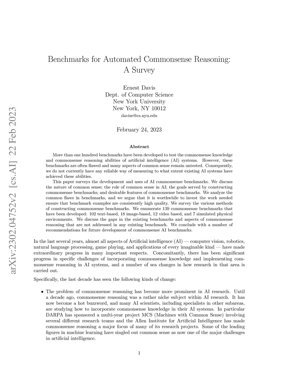 More than one hundred benchmarks have been developed to test the commonsense knowledge and commonsense reasoning abilities of artificial intelligence (AI) systems. However, these benchmarks are often flawed and many aspects of common sense remain untested. Consequently, we do not currently have any reliable way of measuring to what extent existing AI systems have achieved these abilities. This paper surveys the development and uses of AI commonsense benchmarks. We discuss the nature of common sense; the role of common sense in AI; the goals served by constructing commonsense benchmarks; and desirable features of commonsense benchmarks. We analyze the common flaws in benchmarks, and we argue that it is worthwhile to invest the work needed ensure that benchmark examples are consistently high quality. We survey the various methods of constructing commonsense benchmarks. We enumerate 139 commonsense benchmarks that have been developed: 102 text-based, 18 image-based, 12 video based, and 7 simulated physical environments. We discuss the gaps in the existing benchmarks and aspects of commonsense reasoning that are not addressed in any existing benchmark. We conclude with a number of recommendations for future development of commonsense AI benchmarks.