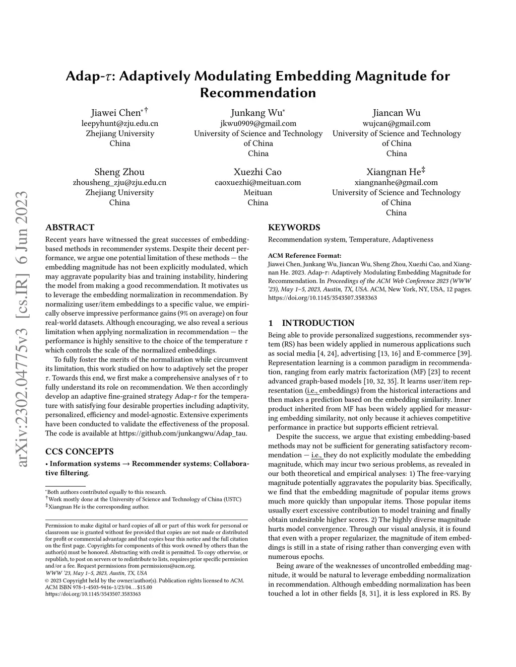 Recent years have witnessed the great successes of embedding-based methods in recommender systems. Despite their decent performance, we argue one potential limitation of these methods -- the embedding magnitude has not been explicitly modulated, which may aggravate popularity bias and training instability, hindering the model from making a good recommendation. It motivates us to leverage the embedding normalization in recommendation. By normalizing user/item embeddings to a specific value, we empirically observe impressive performance gains (9\% on average) on four real-world datasets. Although encouraging, we also reveal a serious limitation when applying normalization in recommendation -- the performance is highly sensitive to the choice of the temperature which controls the scale of the normalized embeddings. To fully foster the merits of the normalization while circumvent its limitation, this work studied on how to adaptively set the proper . Towards this end, we first make a comprehensive analyses of to fully understand its role on recommendation. We then accordingly develop an adaptive fine-grained strategy Adap- for the temperature with satisfying four desirable properties including adaptivity, personalized, efficiency and model-agnostic. Extensive experiments have been conducted to validate the effectiveness of the proposal. The code is available at \url{https://github.com/junkangwu/Adap_tau}.