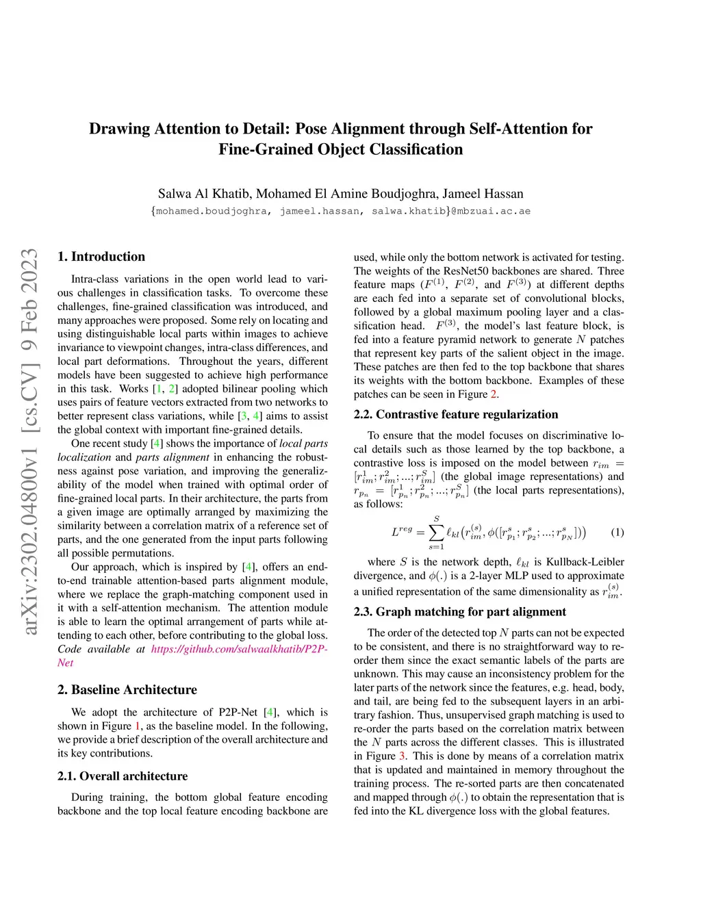 Intra-class variations in the open world lead to various challenges in classification tasks. To overcome these challenges, fine-grained classification was introduced, and many approaches were proposed. Some rely on locating and using distinguishable local parts within images to achieve invariance to viewpoint changes, intra-class differences, and local part deformations. Our approach, which is inspired by P2P-Net, offers an end-to-end trainable attention-based parts alignment module, where we replace the graph-matching component used in it with a self-attention mechanism. The attention module is able to learn the optimal arrangement of parts while attending to each other, before contributing to the global loss.