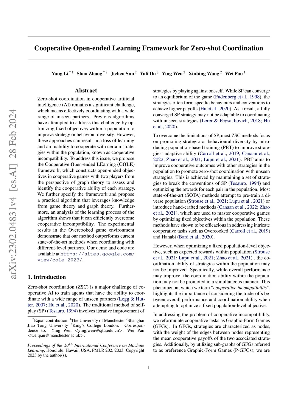 Zero-shot coordination in cooperative artificial intelligence (AI) remains a significant challenge, which means effectively coordinating with a wide range of unseen partners. Previous algorithms have attempted to address this challenge by optimizing fixed objectives within a population to improve strategy or behaviour diversity. However, these approaches can result in a loss of learning and an inability to cooperate with certain strategies within the population, known as cooperative incompatibility. To address this issue, we propose the Cooperative Open-ended LEarning (COLE) framework, which constructs open-ended objectives in cooperative games with two players from the perspective of graph theory to assess and identify the cooperative ability of each strategy. We further specify the framework and propose a practical algorithm that leverages knowledge from game theory and graph theory. Furthermore, an analysis of the learning process of the algorithm shows that it can efficiently overcome cooperative incompatibility. The experimental results in the Overcooked game environment demonstrate that our method outperforms current state-of-the-art methods when coordinating with different-level partners. Our demo is available at https://sites.google.com/view/cole-2023.