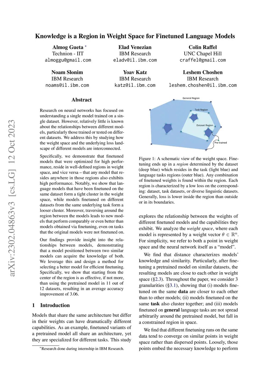 Research on neural networks has focused on understanding a single model trained on a single dataset. However, relatively little is known about the relationships between different models, particularly those trained or tested on different datasets. We address this by studying how the weight space and the underlying loss landscape of different models are interconnected. Specifically, we demonstrate that finetuned models that were optimized for high performance, reside in well-defined regions in weight space, and vice versa -- that any model that resides anywhere in those regions also exhibits high performance. Notably, we show that language models that have been finetuned on the same dataset form a tight cluster in the weight space, while models finetuned on different datasets from the same underlying task form a looser cluster. Moreover, traversing around the region between the models leads to new models that perform comparably or even better than models obtained via finetuning, even on tasks that the original models were not finetuned on. Our findings provide insight into the relationships between models, demonstrating that a model positioned between two similar models can acquire the knowledge of both. We leverage this and design a method for selecting a better model for efficient finetuning. Specifically, we show that starting from the center of the region is as effective, if not more, than using the pretrained model in 11 out of 12 datasets, resulting in an average accuracy improvement of 3.06.