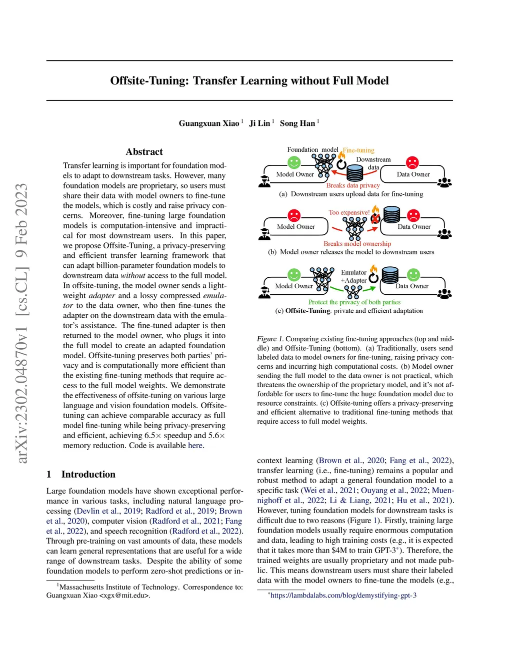 Transfer learning is important for foundation models to adapt to downstream tasks. However, many foundation models are proprietary, so users must share their data with model owners to fine-tune the models, which is costly and raise privacy concerns. Moreover, fine-tuning large foundation models is computation-intensive and impractical for most downstream users. In this paper, we propose Offsite-Tuning, a privacy-preserving and efficient transfer learning framework that can adapt billion-parameter foundation models to downstream data without access to the full model. In offsite-tuning, the model owner sends a light-weight adapter and a lossy compressed emulator to the data owner, who then fine-tunes the adapter on the downstream data with the emulator's assistance. The fine-tuned adapter is then returned to the model owner, who plugs it into the full model to create an adapted foundation model. Offsite-tuning preserves both parties' privacy and is computationally more efficient than the existing fine-tuning methods that require access to the full model weights. We demonstrate the effectiveness of offsite-tuning on various large language and vision foundation models. Offsite-tuning can achieve comparable accuracy as full model fine-tuning while being privacy-preserving and efficient, achieving 6.5x speedup and 5.6x memory reduction. Code is available at https://github.com/mit-han-lab/offsite-tuning.