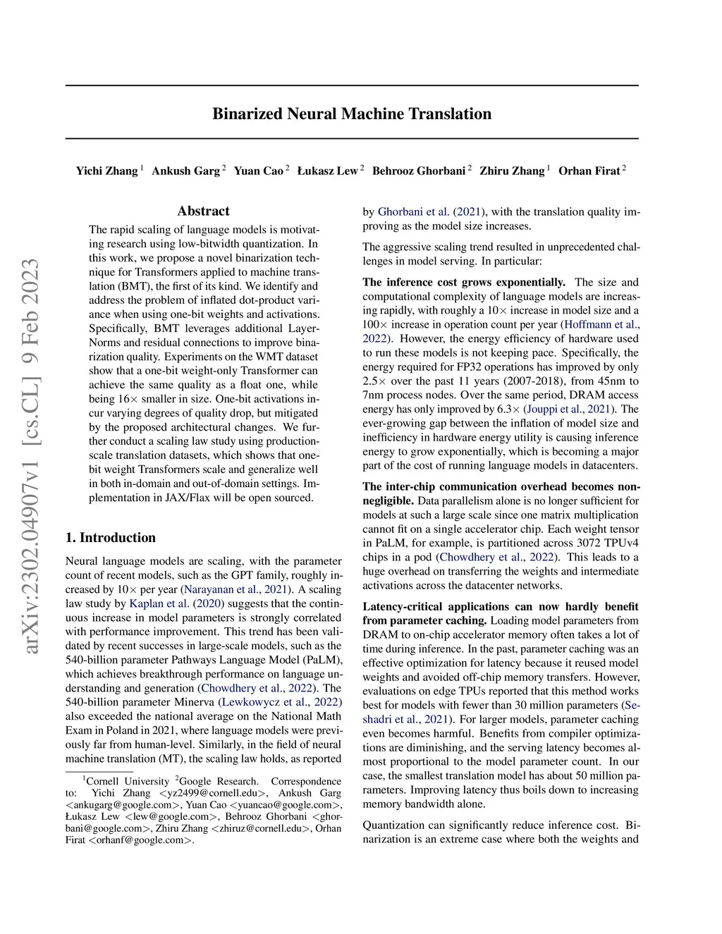 The rapid scaling of language models is motivating research using low-bitwidth quantization. In this work, we propose a novel binarization technique for Transformers applied to machine translation (BMT), the first of its kind. We identify and address the problem of inflated dot-product variance when using one-bit weights and activations. Specifically, BMT leverages additional LayerNorms and residual connections to improve binarization quality. Experiments on the WMT dataset show that a one-bit weight-only Transformer can achieve the same quality as a float one, while being 16x smaller in size. One-bit activations incur varying degrees of quality drop, but mitigated by the proposed architectural changes. We further conduct a scaling law study using production-scale translation datasets, which shows that one-bit weight Transformers scale and generalize well in both in-domain and out-of-domain settings. Implementation in JAX/Flax will be open sourced.