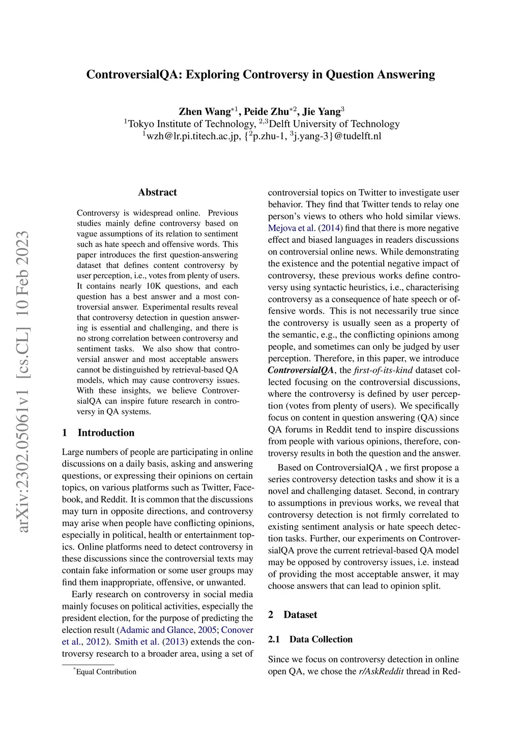 Controversy is widespread online. Previous studies mainly define controversy based on vague assumptions of its relation to sentiment such as hate speech and offensive words. This paper introduces the first question-answering dataset that defines content controversy by user perception, i.e., votes from plenty of users. It contains nearly 10K questions, and each question has a best answer and a most controversial answer. Experimental results reveal that controversy detection in question answering is essential and challenging, and there is no strong correlation between controversy and sentiment tasks.