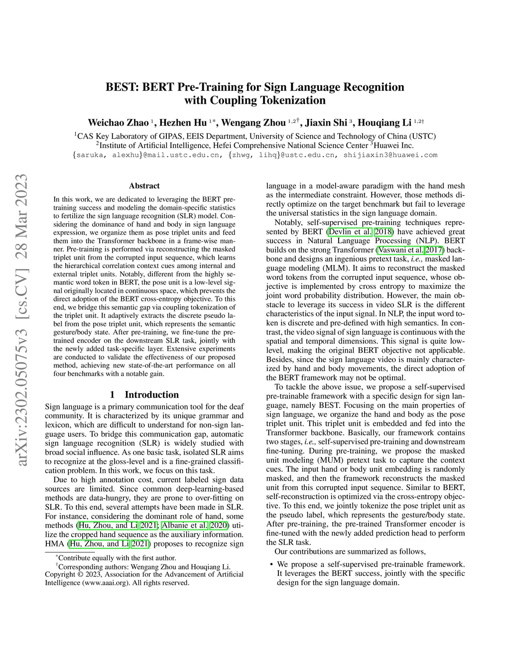 BEST: BERT Pre-Training for Sign Language Recognition with Coupling