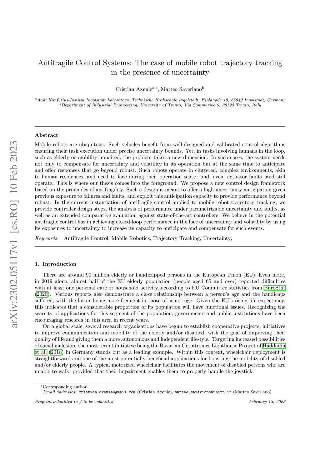 Mobile robots are ubiquitous. Such vehicles benefit from well-designed and calibrated control algorithms ensuring their task execution under precise uncertainty bounds. Yet, in tasks involving humans in the loop, such as elderly or mobility impaired, the problem takes a new dimension. In such cases, the system needs not only to compensate for uncertainty and volatility in its operation but at the same time to anticipate and offer responses that go beyond robust. Such robots operate in cluttered, complex environments, akin to human residences, and need to face during their operation sensor and, even, actuator faults, and still operate. This is where our thesis comes into the foreground. We propose a new control design framework based on the principles of antifragility. Such a design is meant to offer a high uncertainty anticipation given previous exposure to failures and faults, and exploit this anticipation capacity to provide performance beyond robust. In the current instantiation of antifragile control applied to mobile robot trajectory tracking, we provide controller design steps, the analysis of performance under parametrizable uncertainty and faults, as well as an extended comparative evaluation against state-of-the-art controllers. We believe in the potential antifragile control has in achieving closed-loop performance in the face of uncertainty and volatility by using its exposures to uncertainty to increase its capacity to anticipate and compensate for such events.