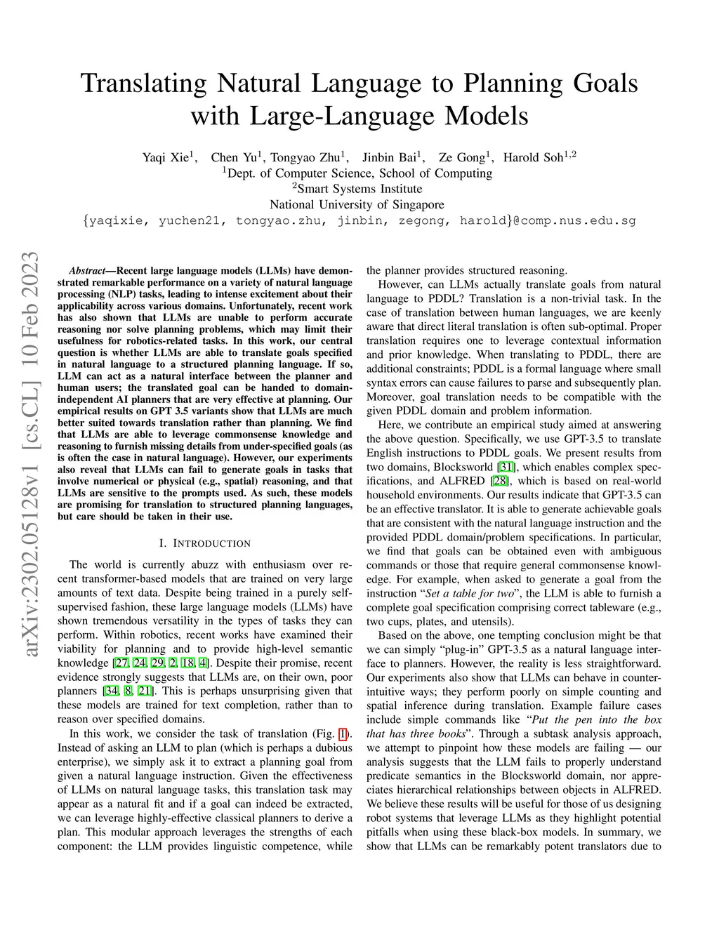 Recent large language models (LLMs) have demonstrated remarkable performance on a variety of natural language processing (NLP) tasks, leading to intense excitement about their applicability across various domains. Unfortunately, recent work has also shown that LLMs are unable to perform accurate reasoning nor solve planning problems, which may limit their usefulness for robotics-related tasks. In this work, our central question is whether LLMs are able to translate goals specified in natural language to a structured planning language. If so, LLM can act as a natural interface between the planner and human users; the translated goal can be handed to domain-independent AI planners that are very effective at planning. Our empirical results on GPT 3.5 variants show that LLMs are much better suited towards translation rather than planning. We find that LLMs are able to leverage commonsense knowledge and reasoning to furnish missing details from under-specified goals (as is often the case in natural language). However, our experiments also reveal that LLMs can fail to generate goals in tasks that involve numerical or physical (e.g., spatial) reasoning, and that LLMs are sensitive to the prompts used. As such, these models are promising for translation to structured planning languages, but care should be taken in their use.