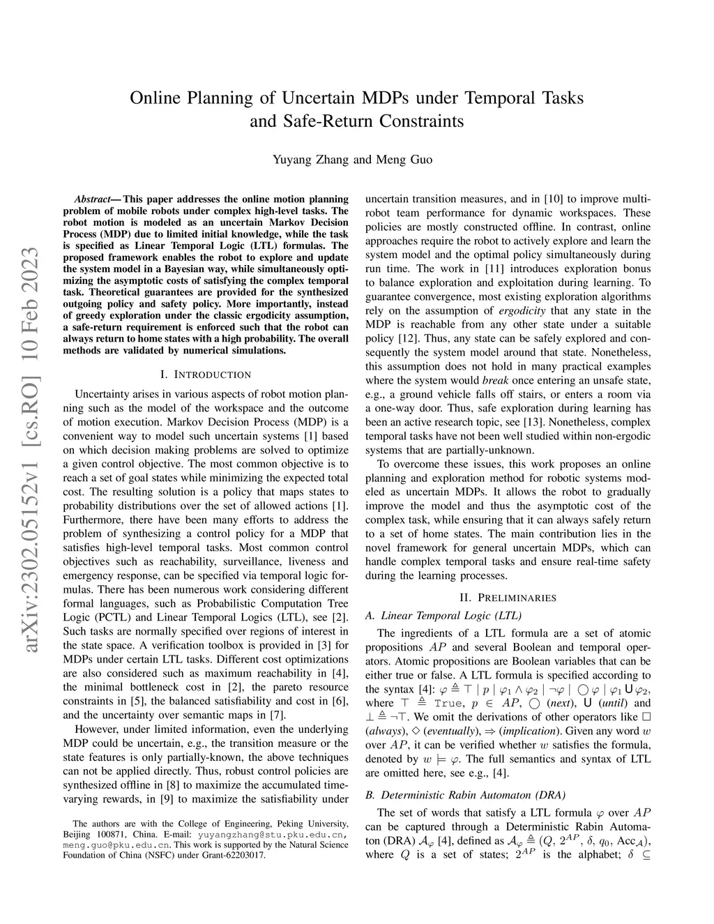 This paper addresses the online motion planning problem of mobile robots under complex high-level tasks. The robot motion is modeled as an uncertain Markov Decision Process (MDP) due to limited initial knowledge, while the task is specified as Linear Temporal Logic (LTL) formulas. The proposed framework enables the robot to explore and update the system model in a Bayesian way, while simultaneously optimizing the asymptotic costs of satisfying the complex temporal task. Theoretical guarantees are provided for the synthesized outgoing policy and safety policy. More importantly, instead of greedy exploration under the classic ergodicity assumption, a safe-return requirement is enforced such that the robot can always return to home states with a high probability. The overall methods are validated by numerical simulations.
