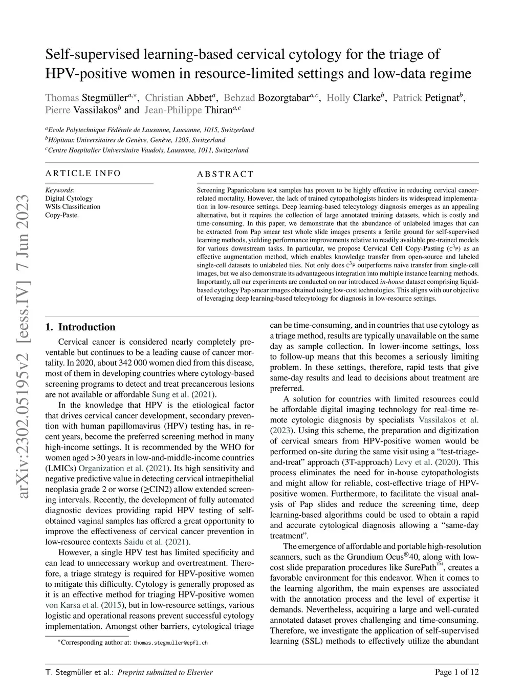Screening Papanicolaou test samples has proven to be highly effective in reducing cervical cancer-related mortality. However, the lack of trained cytopathologists hinders its widespread implementation in low-resource settings. Deep learning-based telecytology diagnosis emerges as an appealing alternative, but it requires the collection of large annotated training datasets, which is costly and time-consuming. In this paper, we demonstrate that the abundance of unlabeled images that can be extracted from Pap smear test whole slide images presents a fertile ground for self-supervised learning methods, yielding performance improvements relative to readily available pre-trained models for various downstream tasks. In particular, we propose \textbf{C}ervical \textbf{C}ell \textbf{C}opy-\textbf{P}asting () as an effective augmentation method, which enables knowledge transfer from open-source and labeled single-cell datasets to unlabeled tiles. Not only does outperforms naive transfer from single-cell images, but we also demonstrate its advantageous integration into multiple instance learning methods. Importantly, all our experiments are conducted on our introduced \textit{in-house} dataset comprising liquid-based cytology Pap smear images obtained using low-cost technologies. This aligns with our objective of leveraging deep learning-based telecytology for diagnosis in low-resource settings.