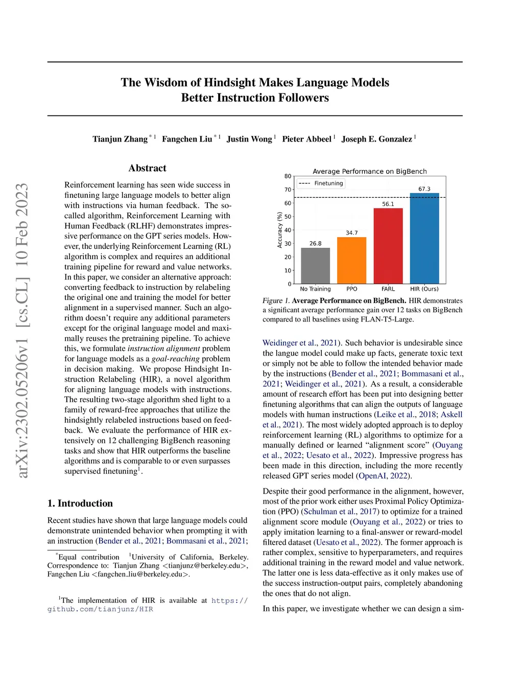 Reinforcement learning has seen wide success in finetuning large language models to better align with instructions via human feedback. The so-called algorithm, Reinforcement Learning with Human Feedback (RLHF) demonstrates impressive performance on the GPT series models. However, the underlying Reinforcement Learning (RL) algorithm is complex and requires an additional training pipeline for reward and value networks. In this paper, we consider an alternative approach: converting feedback to instruction by relabeling the original one and training the model for better alignment in a supervised manner. Such an algorithm doesn't require any additional parameters except for the original language model and maximally reuses the pretraining pipeline. To achieve this, we formulate instruction alignment problem for language models as a goal-reaching problem in decision making. We propose Hindsight Instruction Relabeling (HIR), a novel algorithm for aligning language models with instructions. The resulting two-stage algorithm shed light to a family of reward-free approaches that utilize the hindsightly relabeled instructions based on feedback. We evaluate the performance of HIR extensively on 12 challenging BigBench reasoning tasks and show that HIR outperforms the baseline algorithms and is comparable to or even surpasses supervised finetuning.