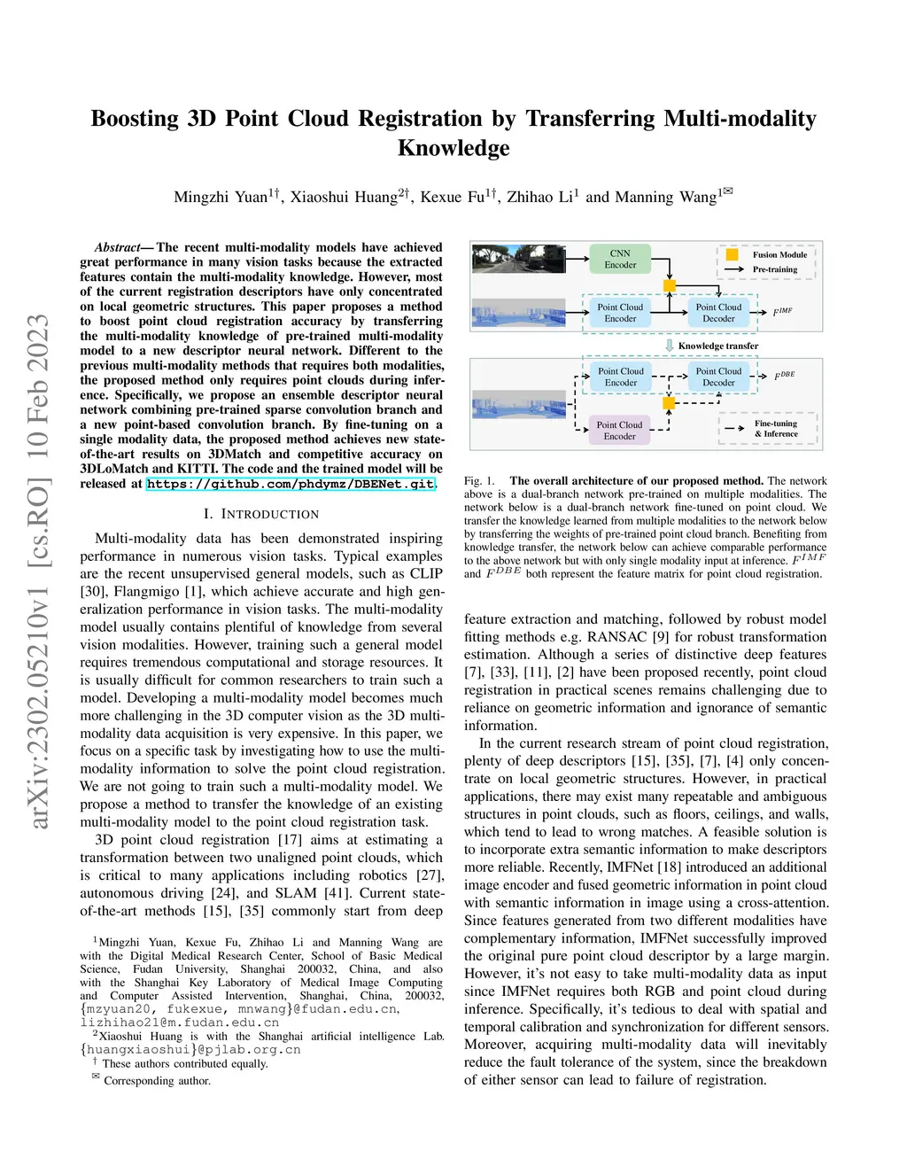 The recent multi-modality models have achieved great performance in many vision tasks because the extracted features contain the multi-modality knowledge. However, most of the current registration descriptors have only concentrated on local geometric structures. This paper proposes a method to boost point cloud registration accuracy by transferring the multi-modality knowledge of pre-trained multi-modality model to a new descriptor neural network. Different to the previous multi-modality methods that requires both modalities, the proposed method only requires point clouds during inference. Specifically, we propose an ensemble descriptor neural network combining pre-trained sparse convolution branch and a new point-based convolution branch. By fine-tuning on a single modality data, the proposed method achieves new state-of-the-art results on 3DMatch and competitive accuracy on 3DLoMatch and KITTI.